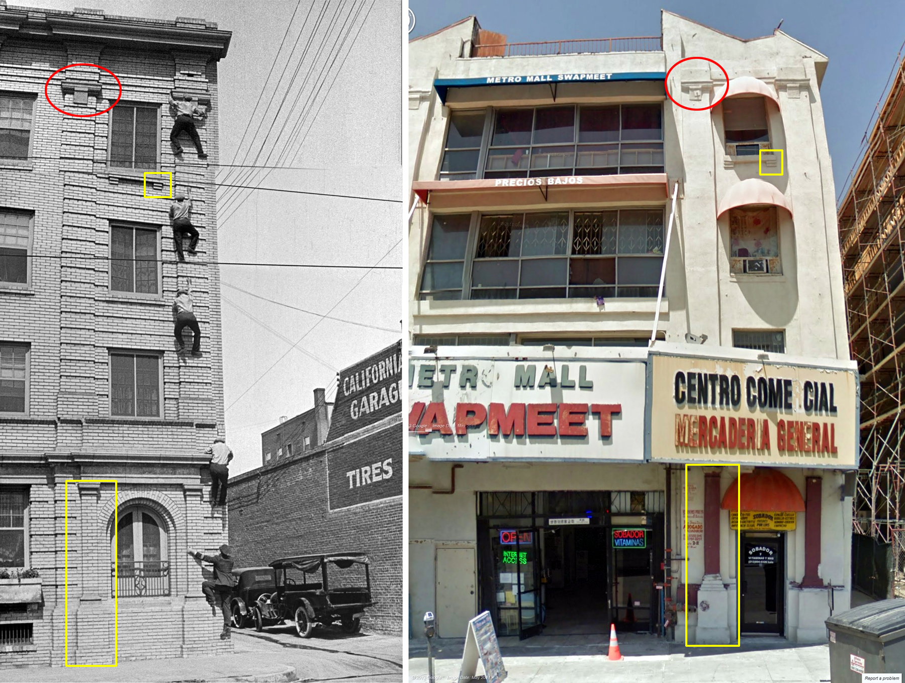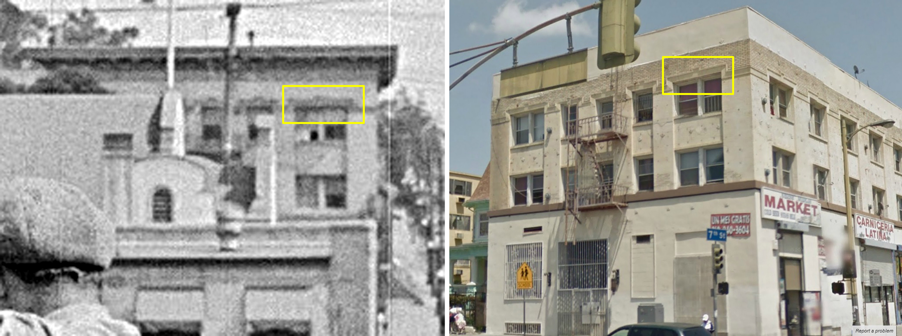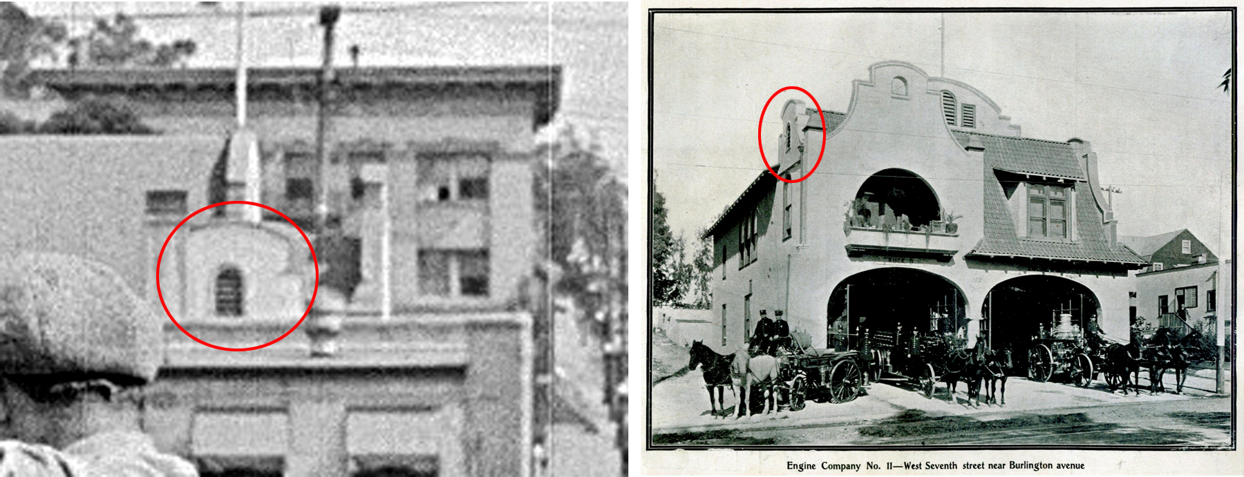 Moreover, vintage aerials photos (left) confirm the match, as do the distinctive parapets of the former L.A.F.D. Engine Co. No. 11 fire station at 1819 W 7th Street that appear down the street.