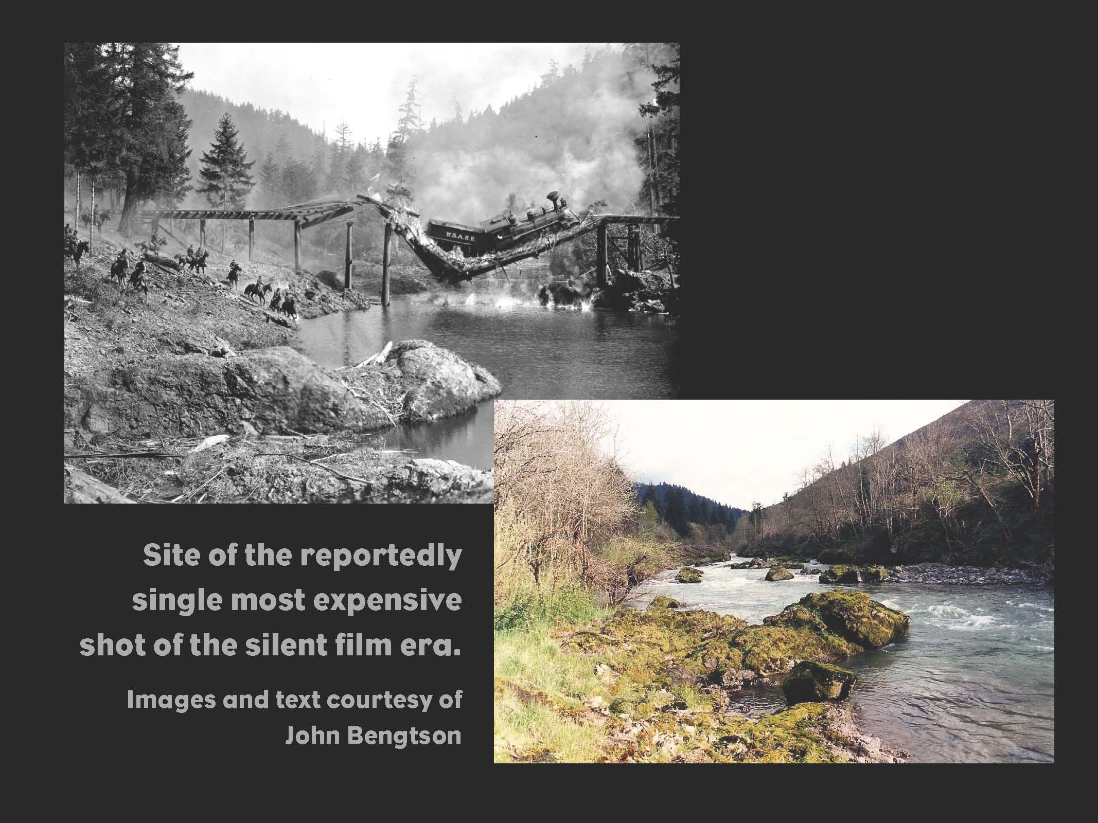 Thank you SO much for your books. I spent my teen years learning about Keaton, Chaplin, Lloyd, and my fascination with them has not abated 40 years later. Your books bring them to life for new generations to enjoy. I’m thinking of adding a trip to Cottage Grove to my itinerary in the future. The one “must see” site for me is where the bridge collapsed in “The General.” Can you tell me how to find the location of your “present day” photograph at the river?