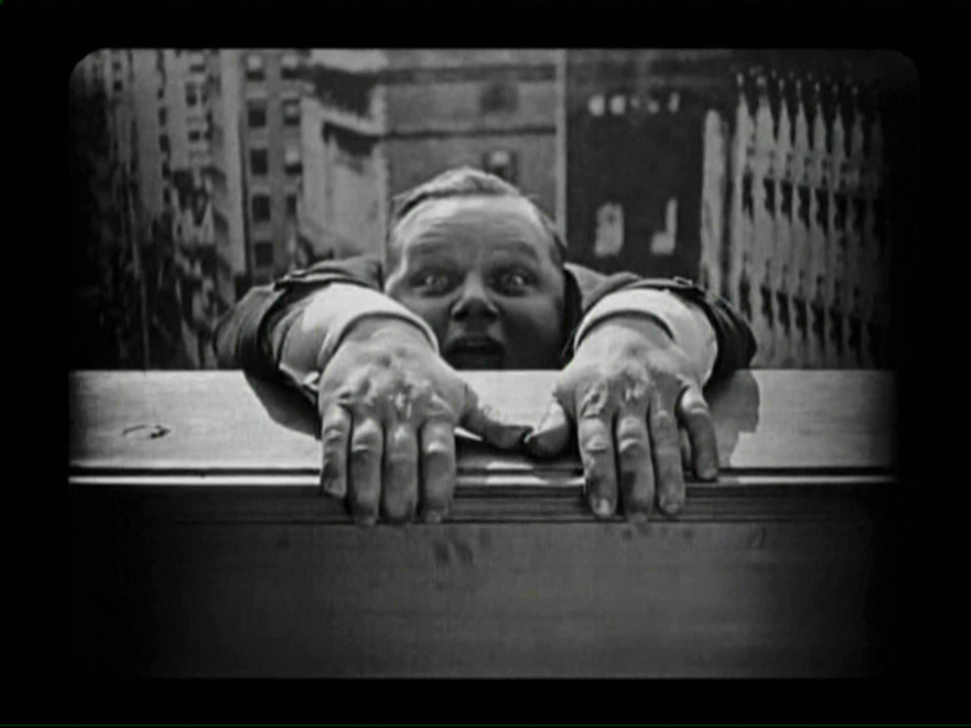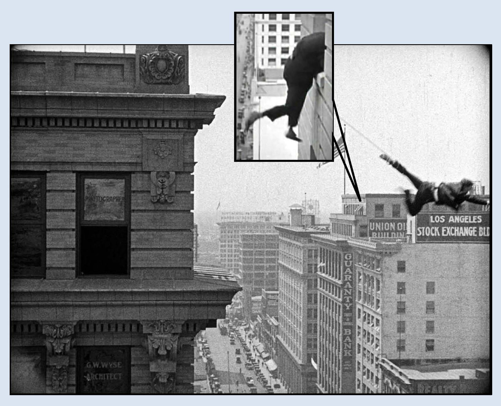 backward through an open window, and hangs precipitously several stories in the air. Though not integral to the plot, Roscoe’s brief scene presages Harold Lloyd’s later stunt climbing work in downtown Los Angeles, and has a direct connection with Lloyd’s masterpiece Safety Last! (1923).