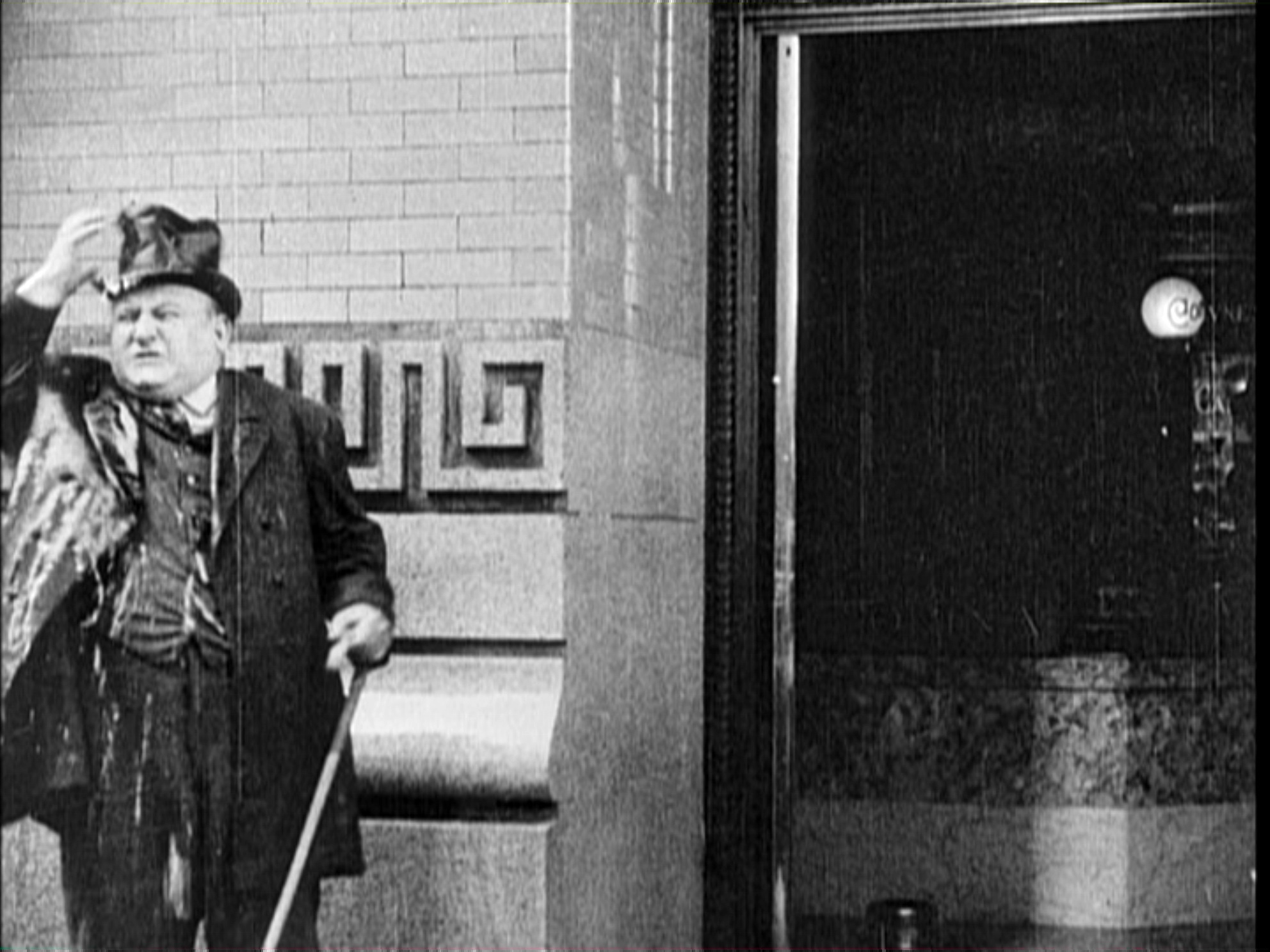 Jess Dandy is soaked with a bucket of water beside the same entrance to the Bartlett Building during this scene from Charlie Chaplin’s The New Janitor (1914).