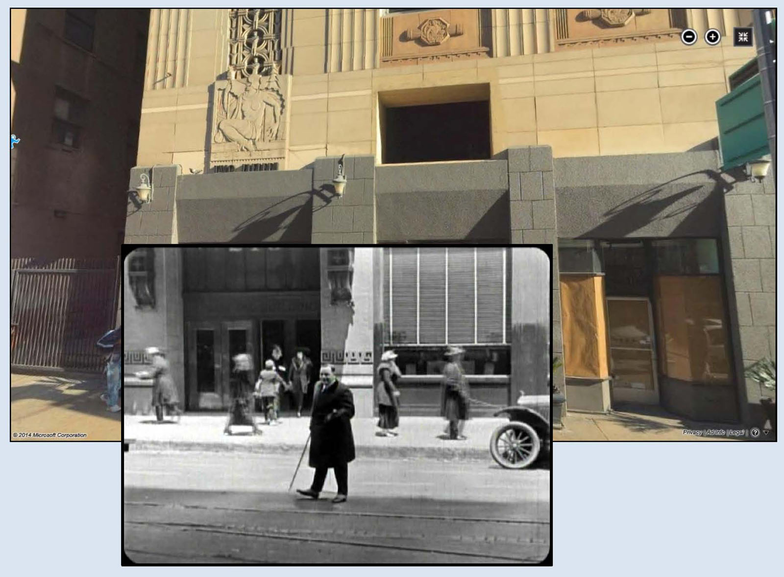 Click to enlarge – Roscoe in TLOTP and Harold in Safety Last! one block further up the street atop the Merchants National Bank Building, prominent in Roscoe’s frame (Lloyd’s approximate location is marked by the gray box). Both views show the side building signs for the Alexandria Hotel (yellow box) and the Security Trust and Savings Bank (red box).