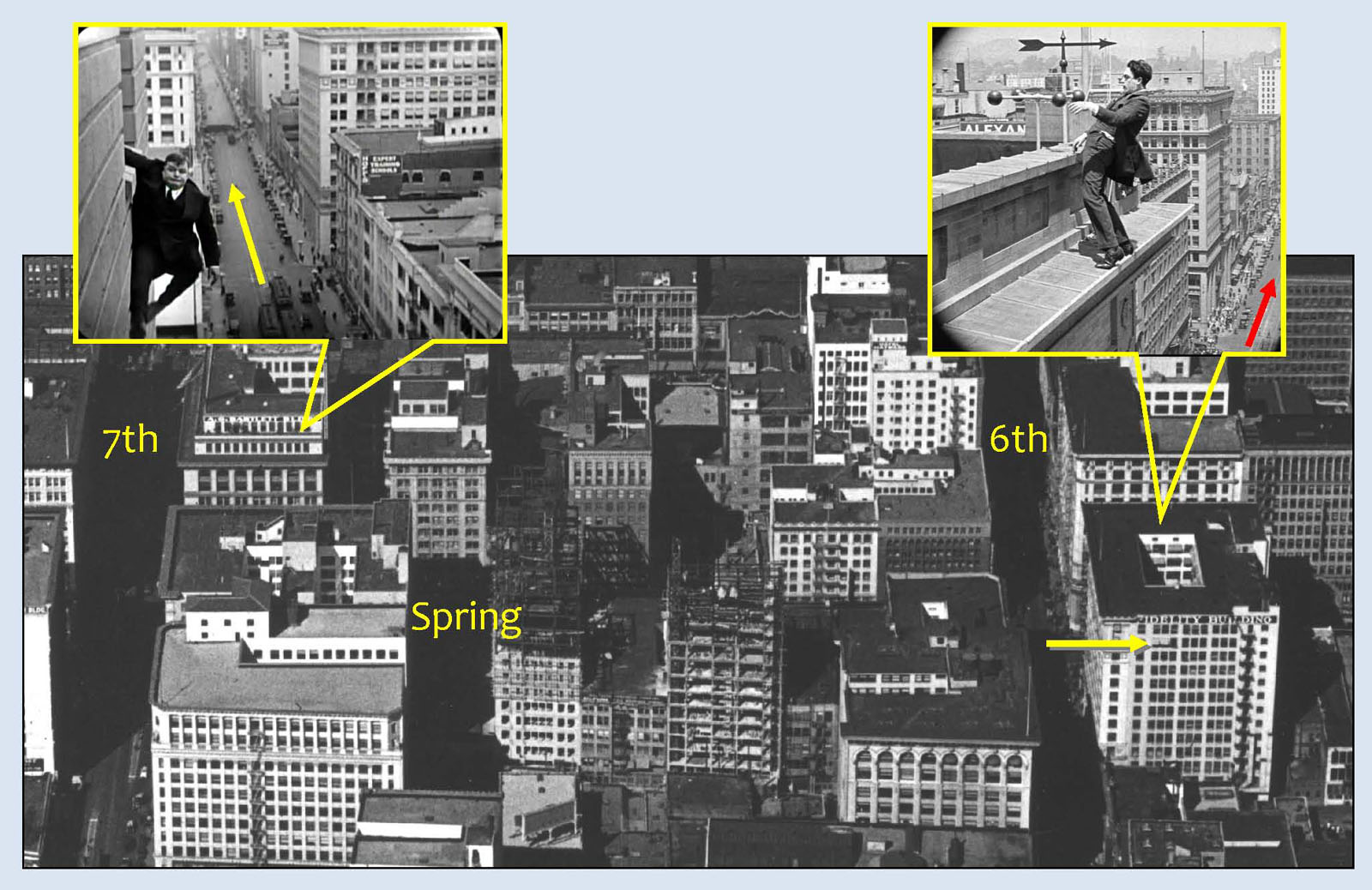 Lloyd filmed a total of five stunt climbing comedies: Look Out Below (1919), High and Dizzy (1919), Never Weaken (1921), Safety Last!, and Feet First (1930). The first three were filmed using sets overlooking the Hill Street Tunnel (see post HERE), while Never Weaken went further, staging scenes filmed atop the extant Ville de Paris Department Store building at the SE corner of 7th and Olive. Thus, when Roscoe filmed TLOTP during April 15 – May 22 of 1920, he filmed in downtown, on a real building, more than a year before Harold did. You can read a list of the 17 real buildings (14 are still standing) that appear in Harold’s stunt films at this PDF link.