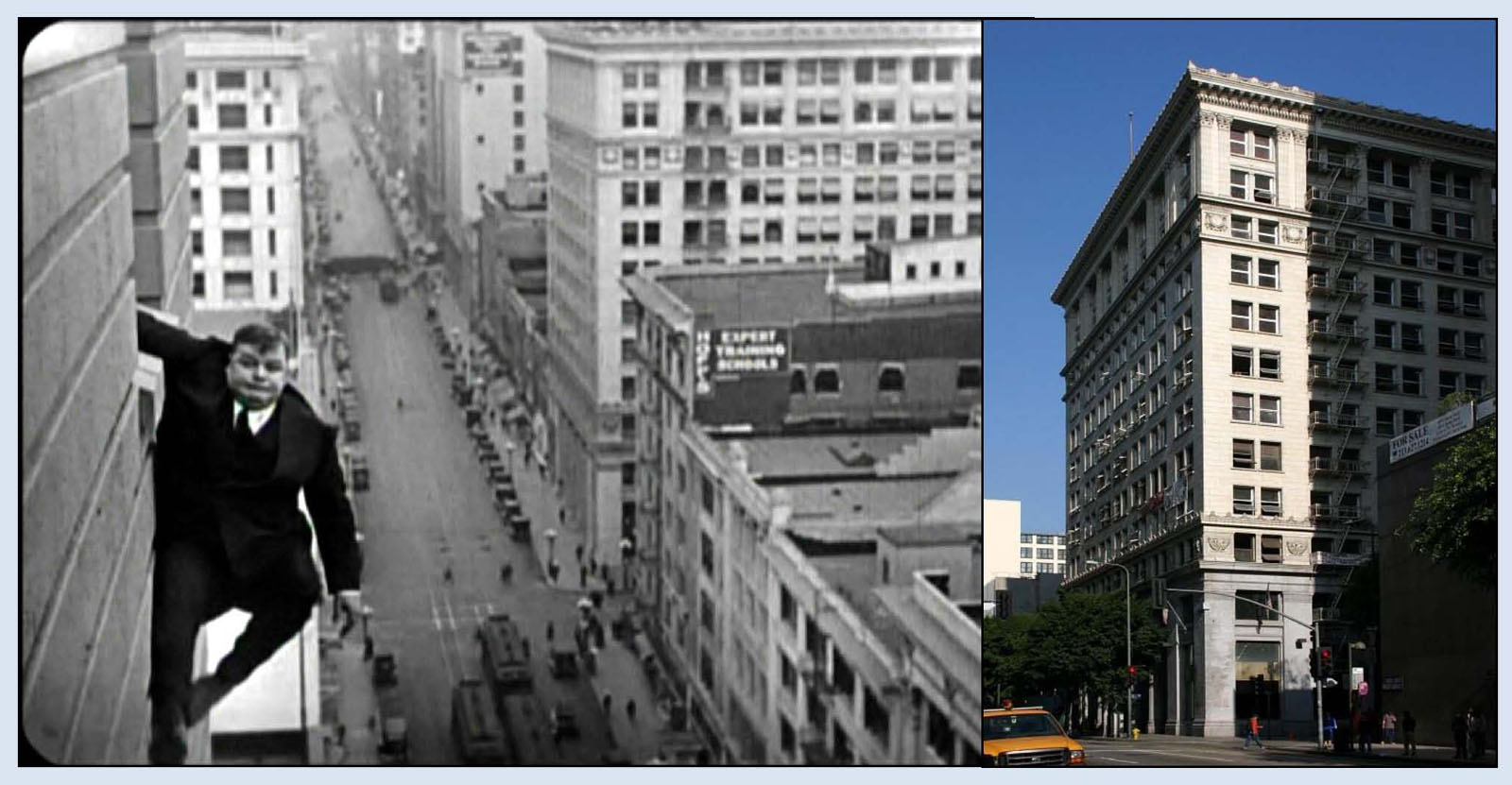 Roscoe filmed his stunt atop the stepped-back terraced roof of the extant Bartlett Building, built in 1911 at 215 W. 7th Street, in the heart of the Los Angeles historic core, converted now to condos and lofts. Behind Roscoe, visible up the street, stands the extant Merchants National Bank Building (now also condos and lofts) at 548 S. Spring Street. Harold Lloyd built a set atop the Merchants Bank to stage the final (and highest) segment of his climb up a skyscraper in Safety Last!