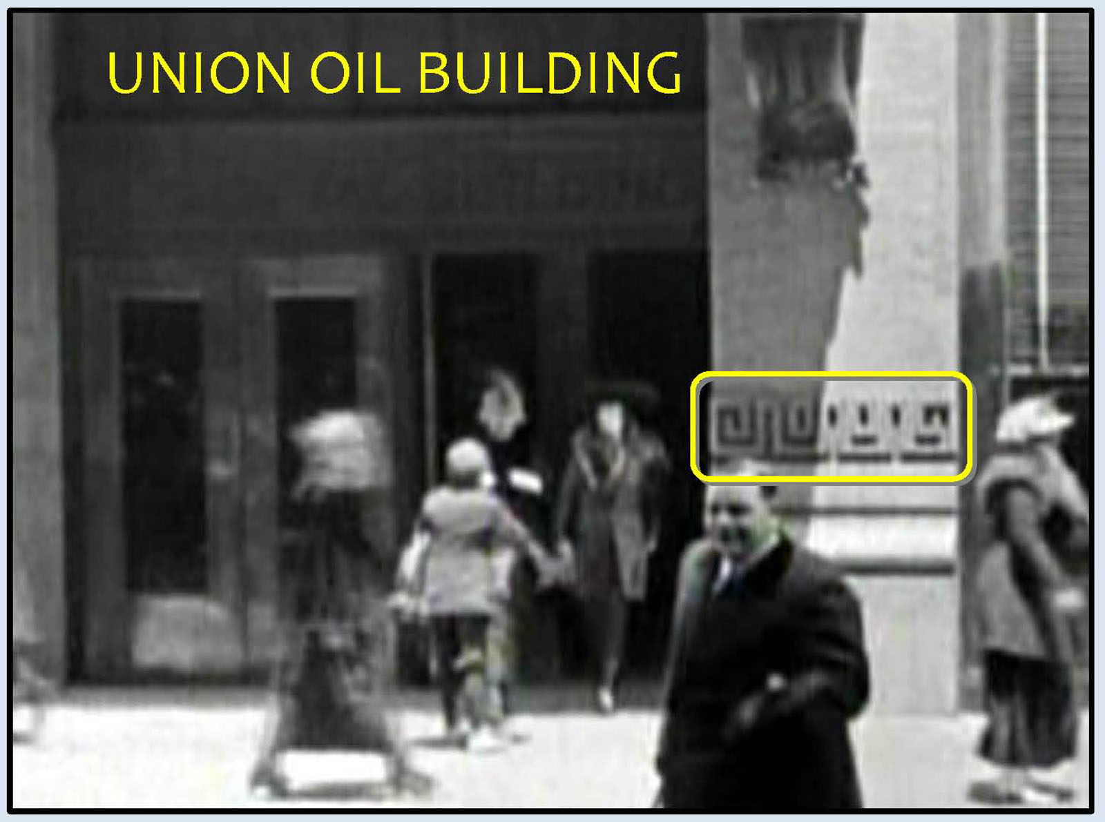 The establishing shot of Roscoe was filmed at the 7th Street entrance to the Bartlett Building, also known at the time as the Union Oil Building, its primary tenant. You can barely read “Union Oil Building” over the door, as well as the bottom edges of the numerals “215” (see below).