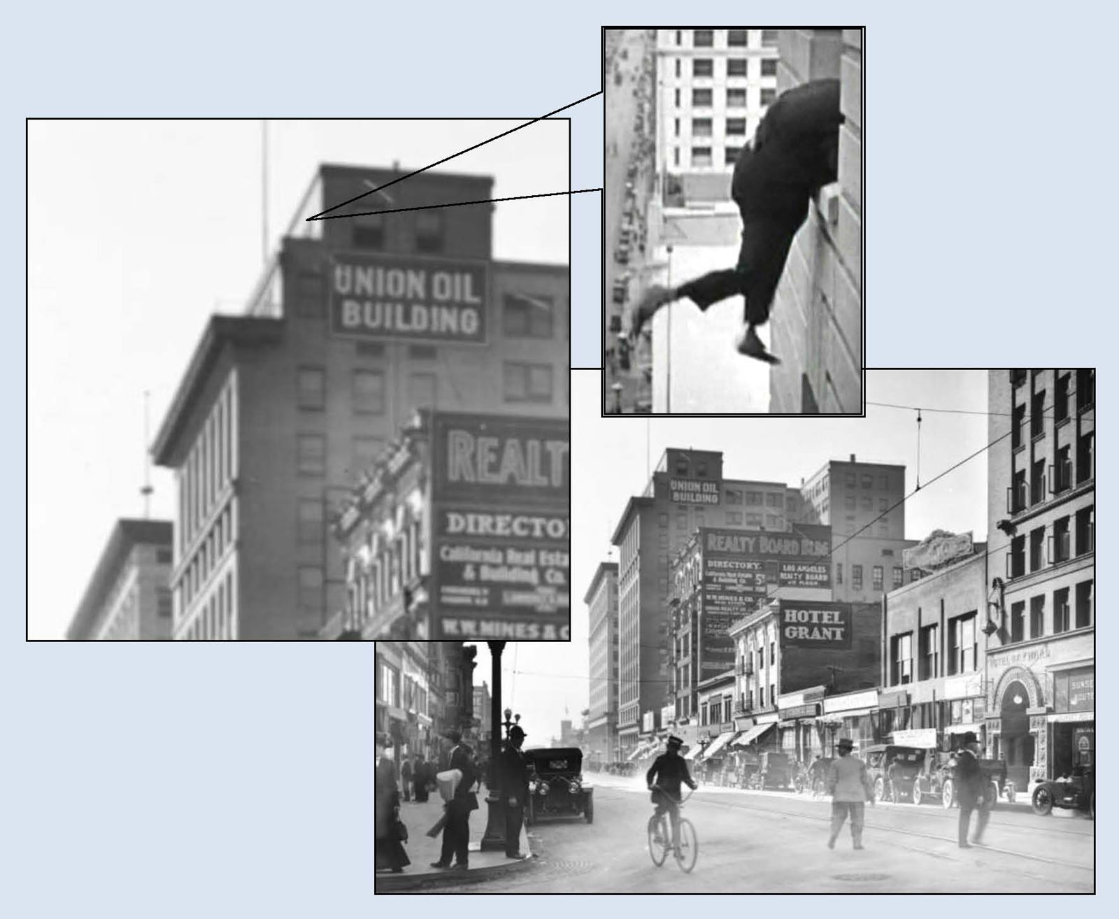 Looking up Spring Street, Roscoe Arbuckle hangs from the Bartlett Building rooftop in The Life of the Party. At back, the Merchants National Bank Building at the NE corner of 5th. You-Are-Here.Com