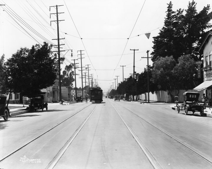 00011236This Los Angeles Public Library view west down Santa Monica from Gower was taken near the time of filming, revealing the Warren Drug Co. that stood at the NW corner. The details match perfectly.