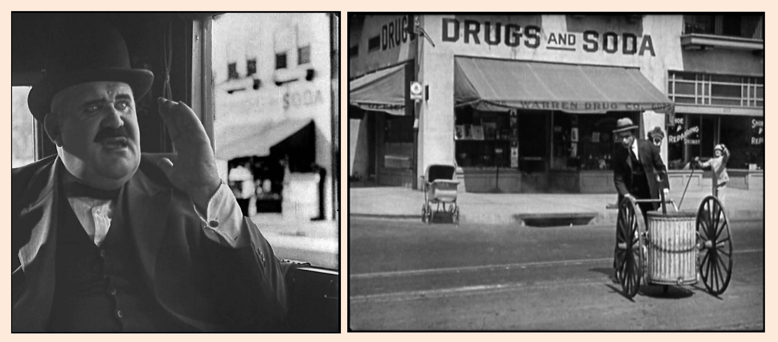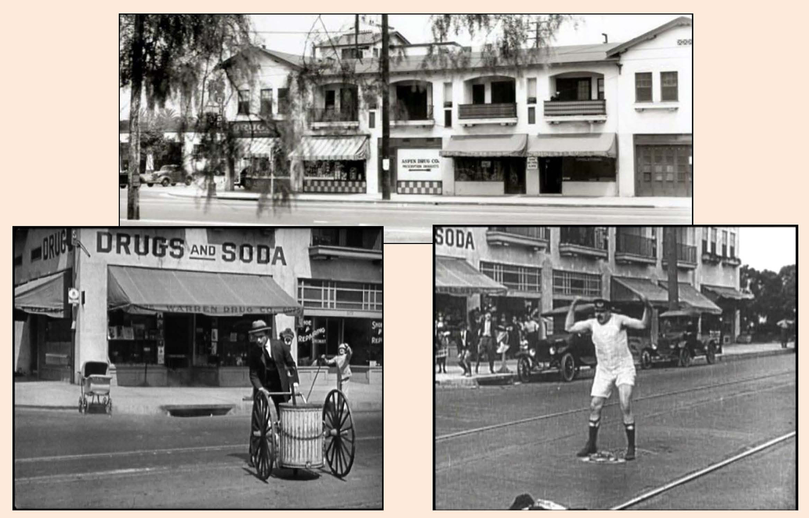 In addition to Lloyd’s comedy I Do, the Warren Drug Co. also appeared during scenes from Larry Semon 1920 short The Suitor, see below. [Note: lacking access to these new photos, I incorrectly reported this corner in my Lloyd book Silent Visions as being one short block further east, at Beachwood, rather than at Gower.]