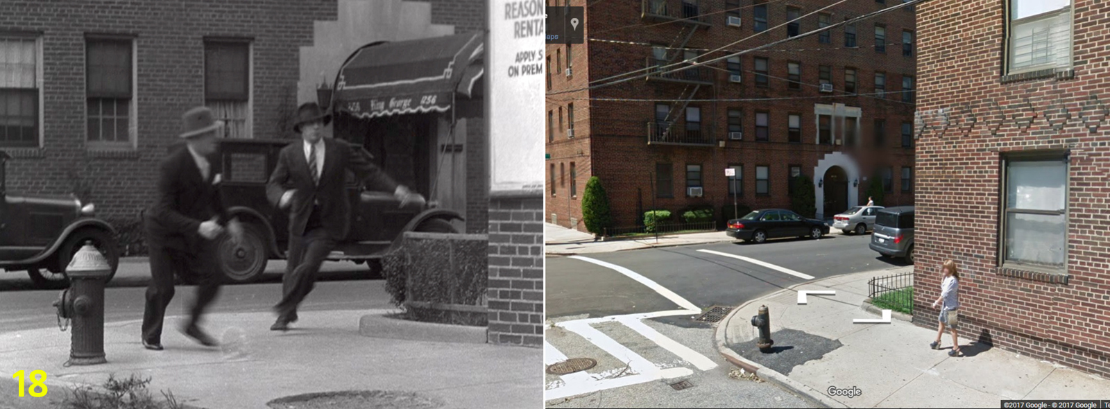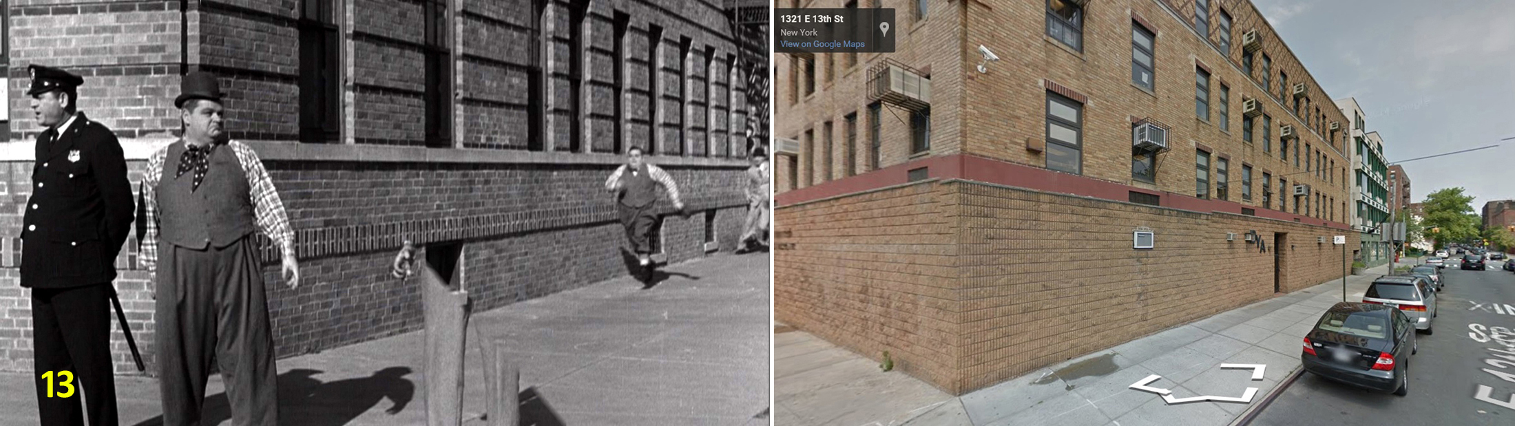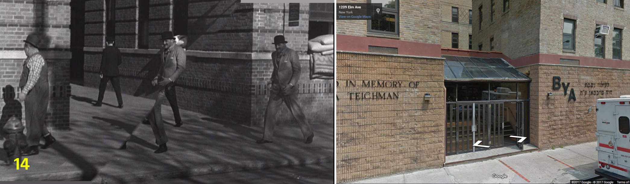 Not realizing his savior the cop has turned into the building’s interior court, Roscoe blithely saunters west along Elm (14), unconcerned his nemesis is following him. The building is now home to the Bais Yaakov Academy (BYA). As a further confirming clue, the fireplug (14) in the movie frame above is exactly where the 1930 Sanborn fire insurance maps shows it to be.