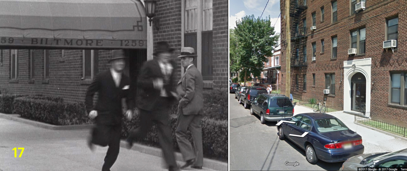 The thugs also turn the corner of the Biltmore Apartment, from E 13th onto Locust, with the King George apartment entrance (18) behind them. Not visible in the film, the name ‘King George’ is carved in the second floor mantle above the curved entrance.