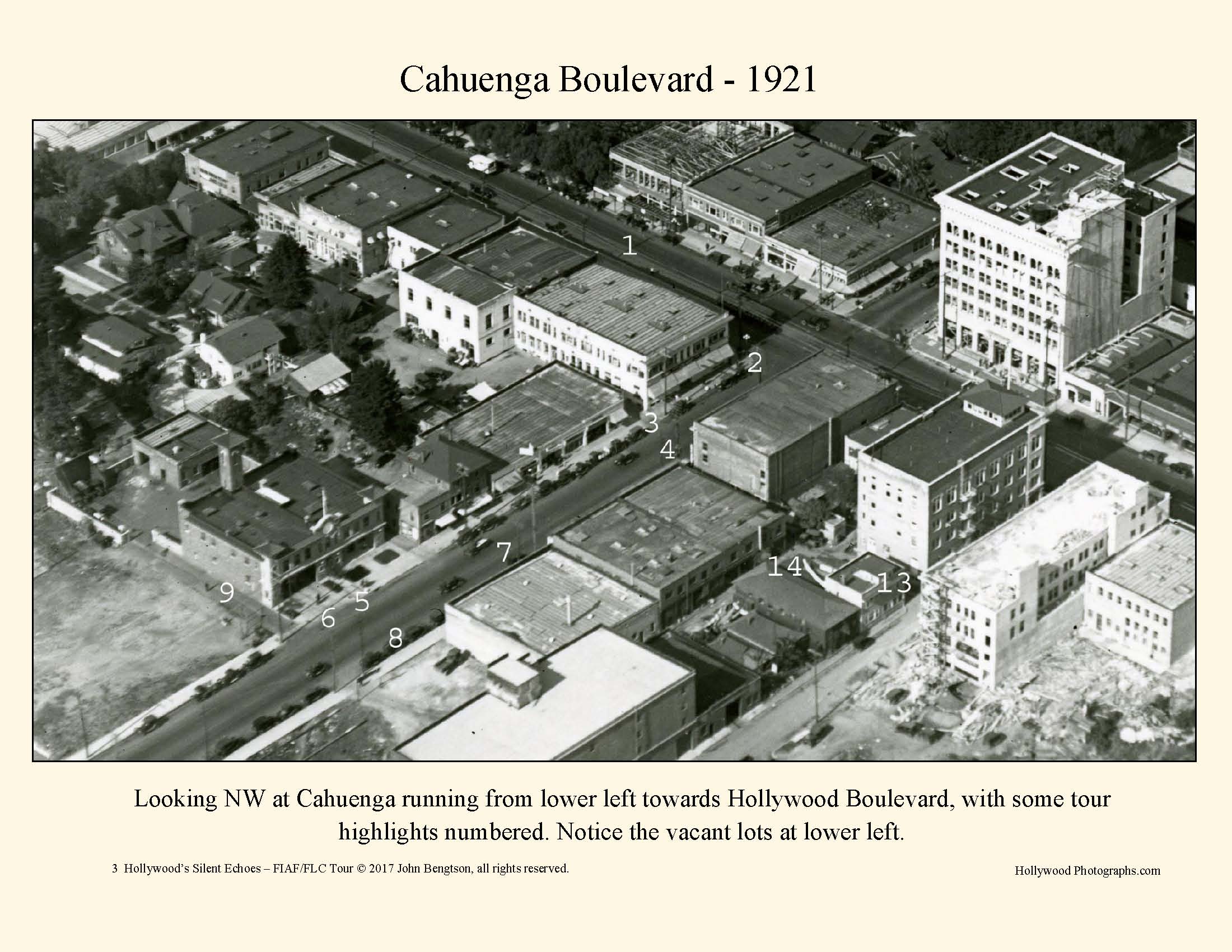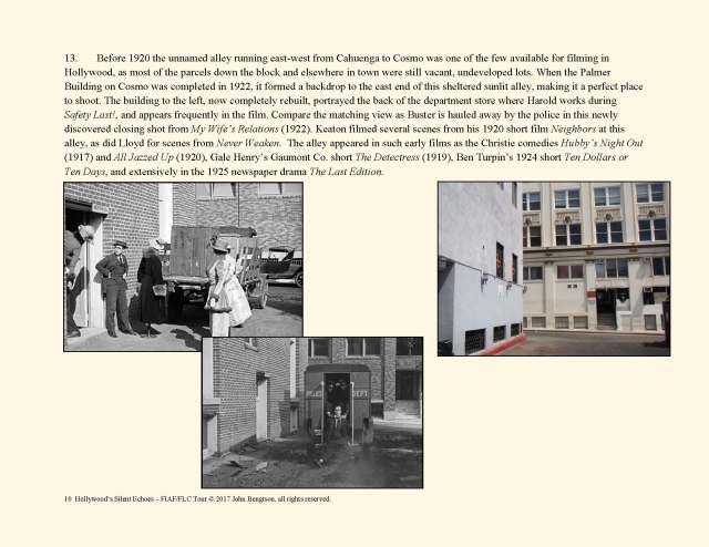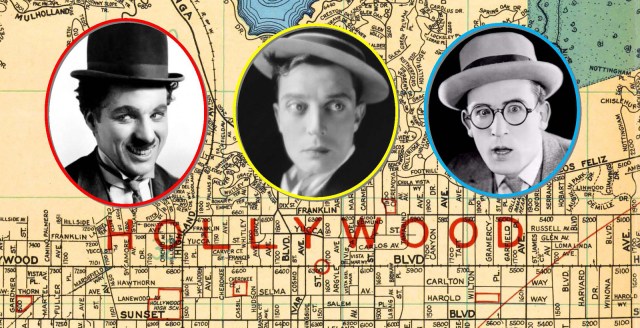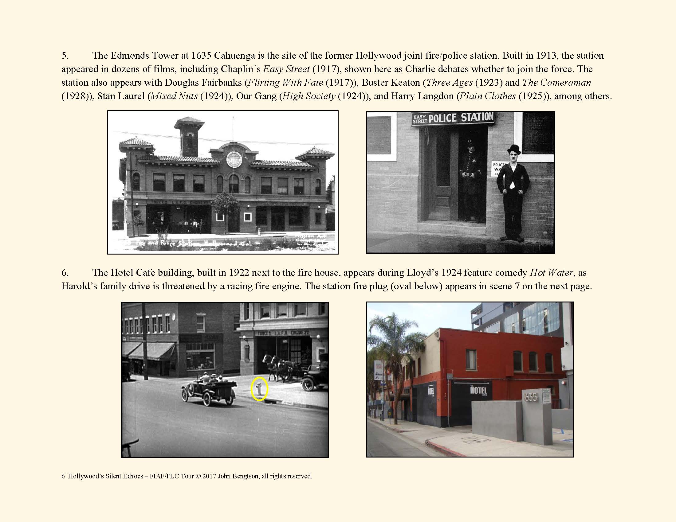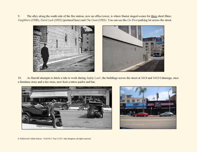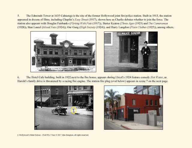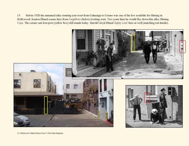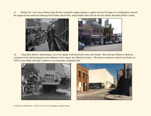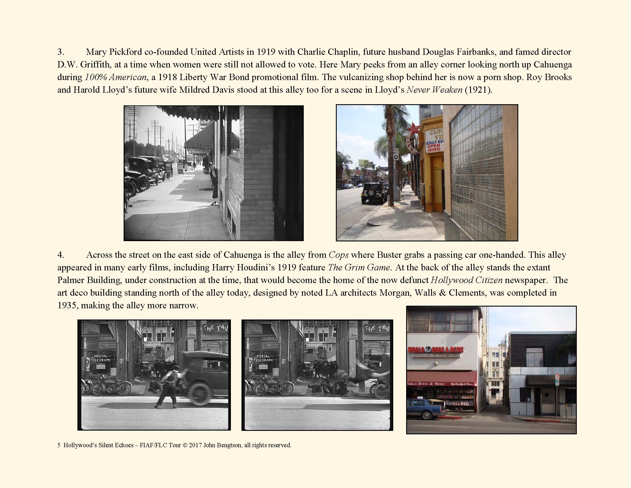 [Tour download] Late in 1921 a mob of angry police chased Buster Keaton down a narrow Hollywood alley towards Cahuenga Boulevard. Entering the street Buster saw to his right a corner where “America’s Sweetheart” Mary Pickford filmed a scene in 1918 beside what is now an adult book store. To his left Buster saw the former Hollywood fire/police station where he would shoot five different films. All seems lost when Buster boldly stops and turns to face his pursuers – then suddenly, grabbing a passing car one-handed, he flies out of frame to safety. This breathtaking stunt, appearing in Keaton’s most famous short film Cops (1922), was filmed on Cahuenga just south of Hollywood Boulevard.