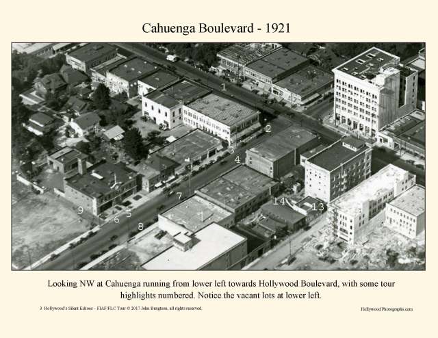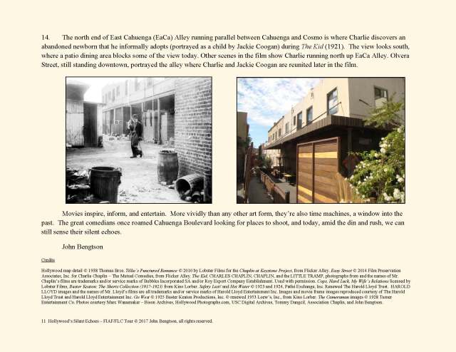 Remarkably, the great silent film comedians Charlie Chaplin, Buster Keaton, and Harold Lloyd filmed more frequently on the block of Cahuenga south of Hollywood Boulevard than at any other spot in town. It’s easy to speculate why. All three stars had studios close by (the Keaton Studio was just six blocks to the south), and with its numerous alleys and generic commercial buildings, filming on this “urban” street saved them from making trips to downtown Los Angeles to shoot. More remarkably, each star filmed an iconic masterpiece, The Kid, Cops, and Safety Last!, respectively, at the same Cahuenga alley.