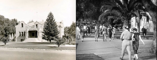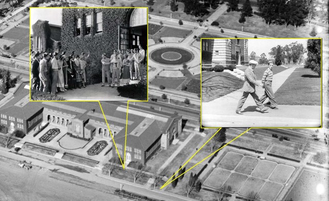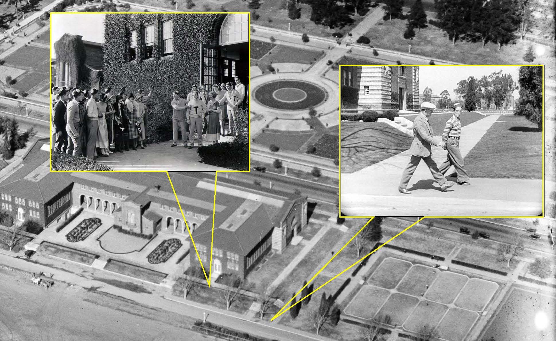 The former State Exposition Building (Bowen Hall) at Exposition Park, with the sunken rose garden at back. Harold has unwittingly agreed to buy the gang ice cream (l), while Buster strolls near by in College. LAPL.