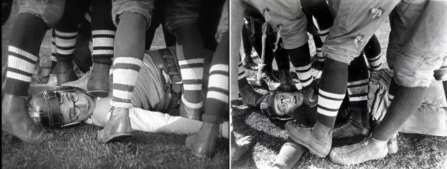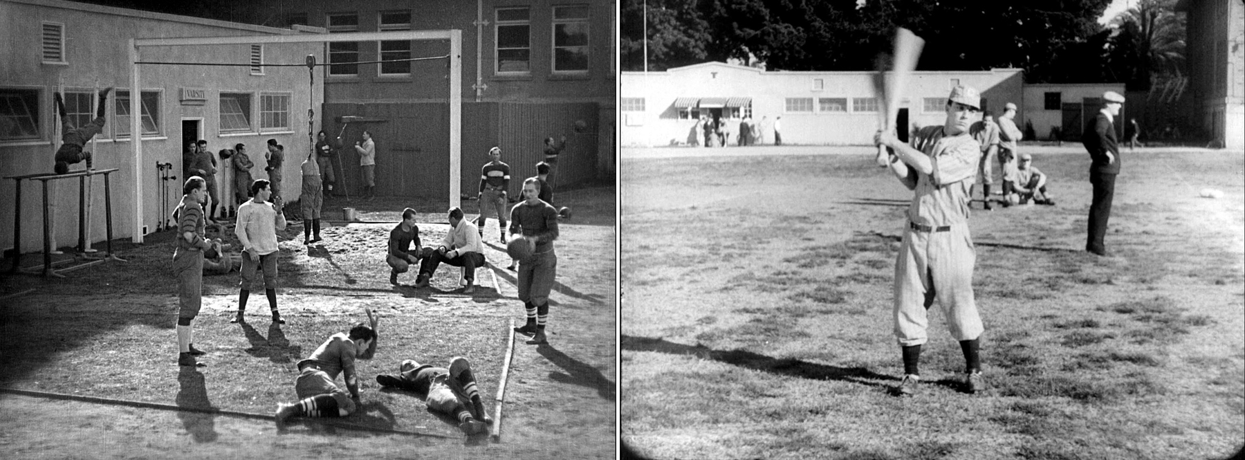 The USC football team originally played home games at modest Bovard Field, behind the USC Old College Building, equipped with wooden bleachers that seated only a few thousand people. Out‐manned during the early years, the press dubbed the USC team the “Trojans” for fighting on despite overwhelming odds against better‐equipped opponents. Lloyd filmed all of the football practice scenes at this field, used also for Keaton’s baseball scenes in College, and for the football scenes in Keaton’s Three Ages (1923).
