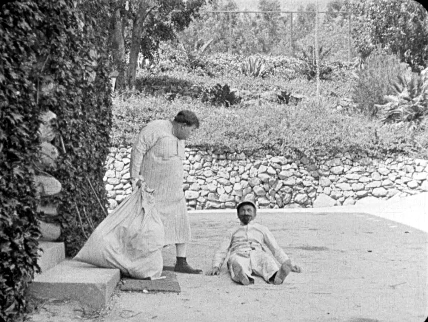 The hot springs were well known to the Native Americans, and Spanish missionaries, leading to the first modest resort that opened here in the 1860s.  The 1906 Sanborn fire insurance map for the resort shows a large bath house for men, complete with a barber shop, adjoining a smaller separate bath house for women, both covered, standing north of the hotel, accessible by an open bridged walkway beside the main entrance. A tennis court adjoined the bath houses to the east, its fence appears behind Roscoe (left). Standing apart from the hotel, further back, was an oval-shaped “Hot Lake,” likely the concrete pool appearing in the film (right), with nearby quarters and dining room for the servants and staff. As a history buff, it’s frustrating to see how little use Arbuckle as director made of the locale. A tight shot of the back entrance porch, a scene played out at the east end of the hotel, nothing on