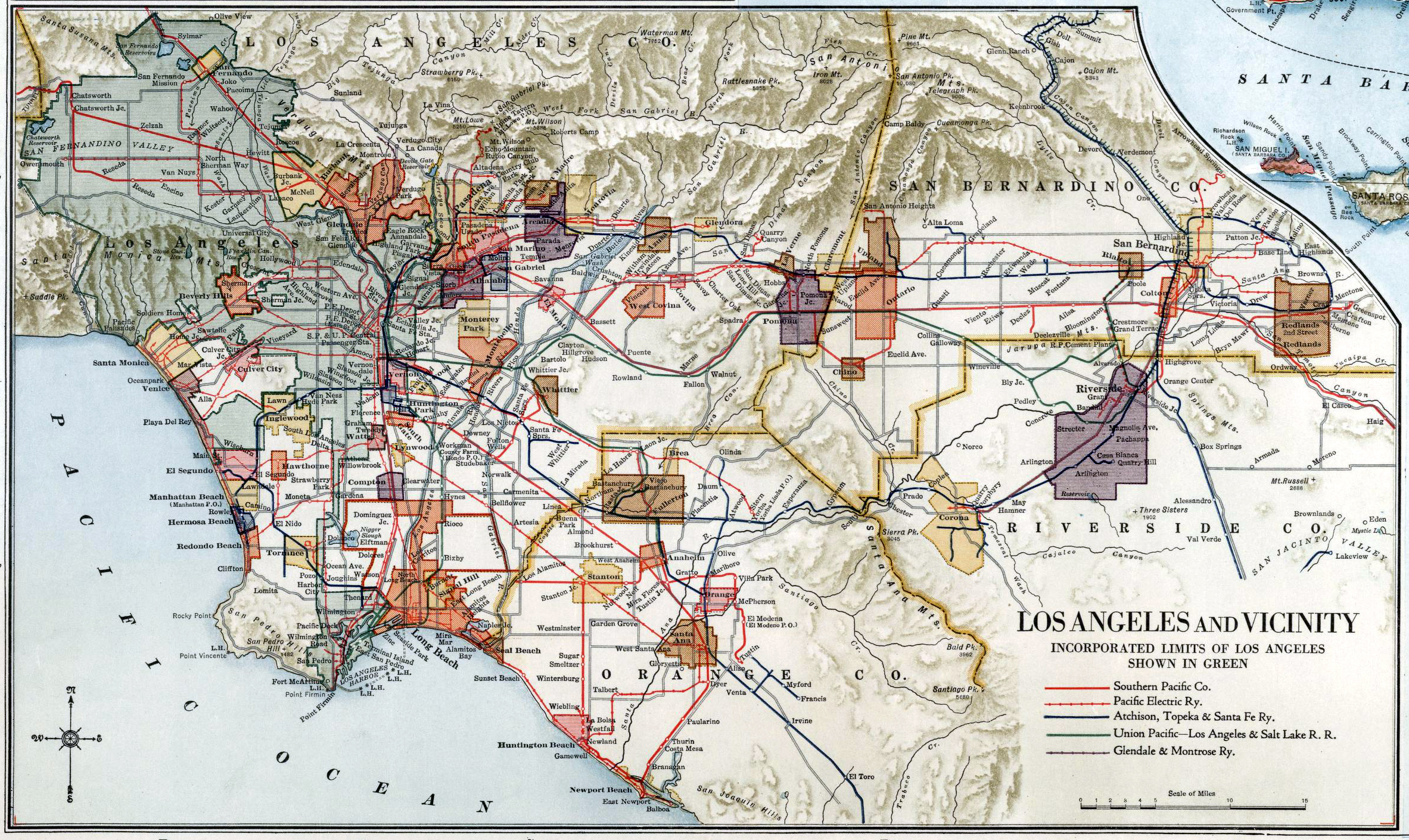 Click to enlarge. Arbuckle’s crew likely arrived by train. This 1926 railroad map shows the route from the studio in Long Beach, lower left, to the Arrowhead Resort, upper right. It seems like a long way to go for such simple scenes. David Rumsey.