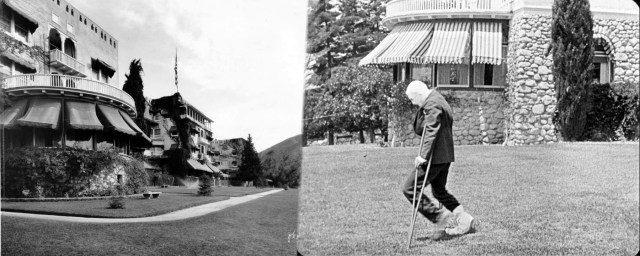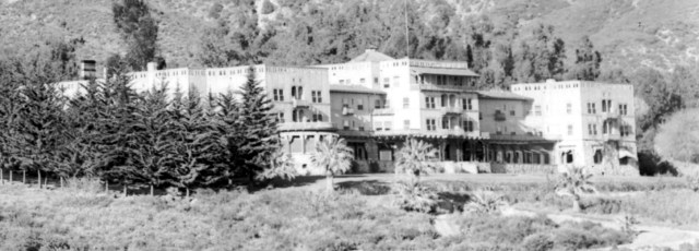 Already well-established when the Comique crew came to film, the resort grew in popularity through the years, providing Hollywood types a place to relax and play and get away from it all. By 1938 a group including Joseph M. Schenck, Constance Bennett, Al Jolson, Darryl Zanuck, and Claudette Colbert were reported to have purchased the resort, only to have the hotel burn to the ground the same year. Famed African-American architect Paul R. Williams designed plans for a new six-story resort, opening in 1939, that continued to attract golden-era stars for many years. Esther Williams was a frequent guest, and Humphrey Bogart filmed High Sierra here in 1941. Elizabeth Taylor spent part of her honeymoon (the first one!) here in 1950 – at the time her father-in-law Conrad Hilton owned the place. But as jet travel made far-flung getaways more appealing, the resort lost favor, eventually shutting down in the 1950s. The hotel was purchased by the Campus Crusade for Christ in 1962. Long shuttered, recent accounts say the property is now available for sale.