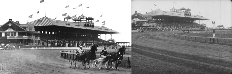 The Yonkers Raceway in 1905, including the clubhouse where Roscoe and Buster filmed at left, and how it appears in Oh Doctor!