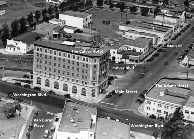 The most prominent landmark in downtown Culver City is the six story triangular Harry Culver Building which opened on September 4, 1924 on Main Street between Washington and Culver Boulevards (it can actually be seen while under construction in Our Gang’s, SUNDOWN LTD.). This “skyscraper” was designed to house Harry Culver’s (the city’s namesake and prominent citizen) headquarters on the lower two floors with the top four floors being designated The Hunt Hotel, later to be the Culver Hotel.