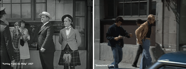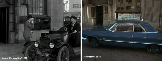 Stan and Ollie stand to the left of the front door of the Culver Building in 1927 during PUTTING PANTS ON PHILIP. Nearly 50 years later, Starsky & Hutch are about to duck for cover in “Snowstorm”. By 1975 only the mounting holes for the “Harry H. Culver And Company” plaque remained.