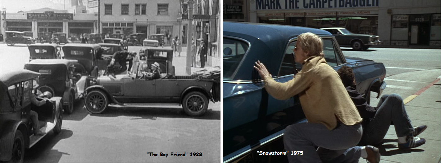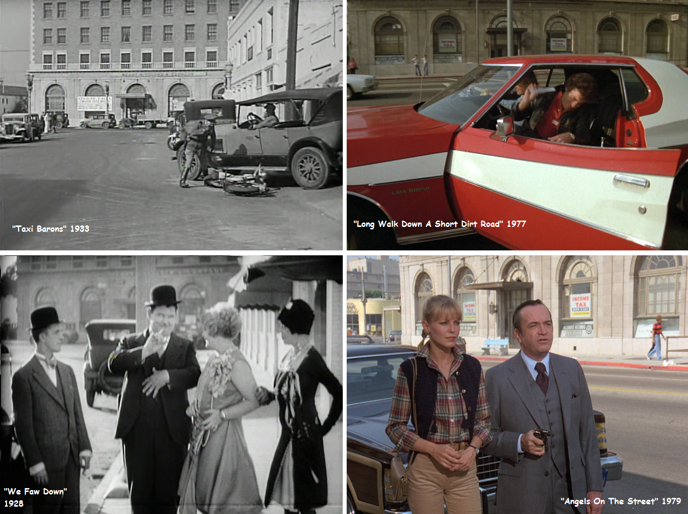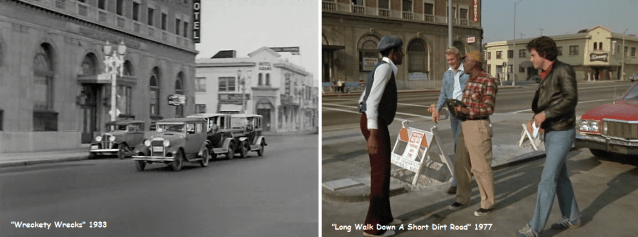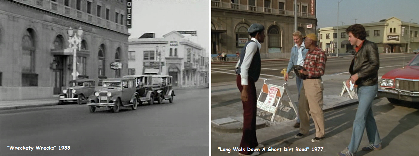 We can again see the Culver and the Adams Hotels from Washington Boulevard, but from a slightly different angle, in the Taxi Boys film, WRECKETY WRECKS, in 1933. Starsky & Hutch show us the same view again forty four years later.