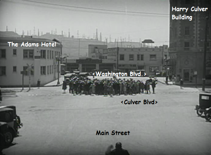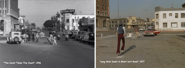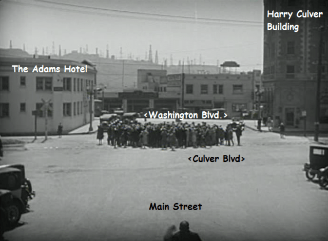 Charley Chase’s, THE COUNT TAKES THE COUNT, gives us a nice view looking up Washington Boulevard towards Main Street with the Culver Hotel on the left and the Adams Hotel visible beyond. By the time Starsky & Hutch take a “Long Walk Down A Short Dirt Road” forty one years later, several of the buildings seen on the right in the Chase film (in front of the parked cars) were gone. But the road barricades remained.