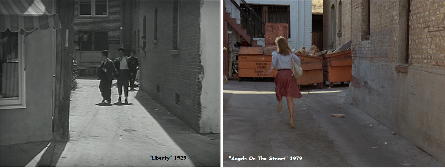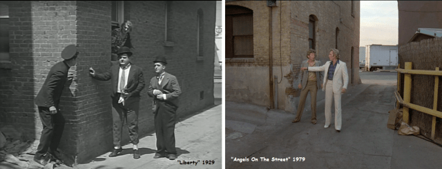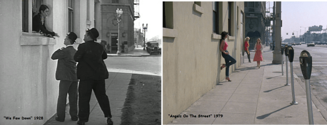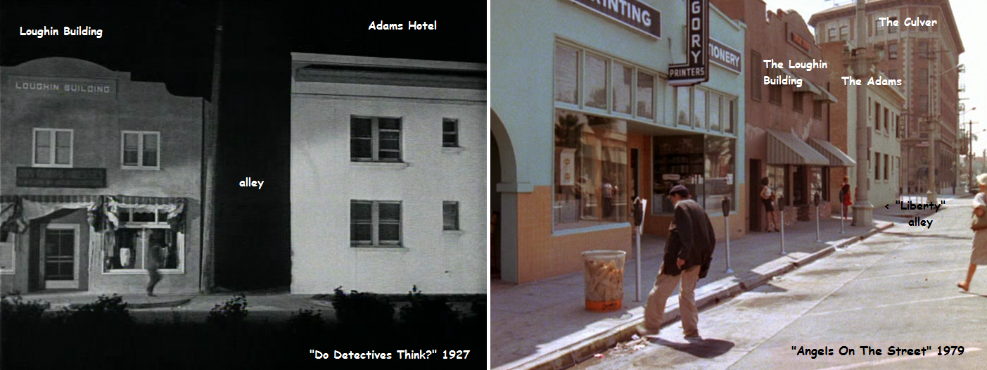 Oliver Hardy passes the Loughin Building, the “Liberty” alley entrance, and the Adams Hotel as he runs down Culver Boulevard in the direction of Main Street and the Culver Hotel in DO DETECTIVES THINK (1927). The shot on the right is the same area, looking towards the Culver Hotel, as seen in 1979 in “Angels On The Street”.