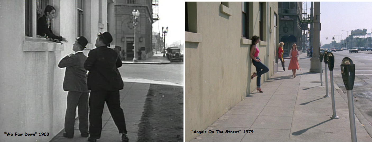 Stan and Ollie are standing on the Culver Boulevard side of the Adams Hotel, just a little past the alleyway entrance, in WE FAW DOWN from 1928. Nearly the exact same shot was used again in 1979 for “Angels On The Street.” Main Street and the Culver Hotel are in the background of both scenes. Unfortunately this entire block of buildings, including the Adams, no longer exists and has been replaced by a parking lot.
