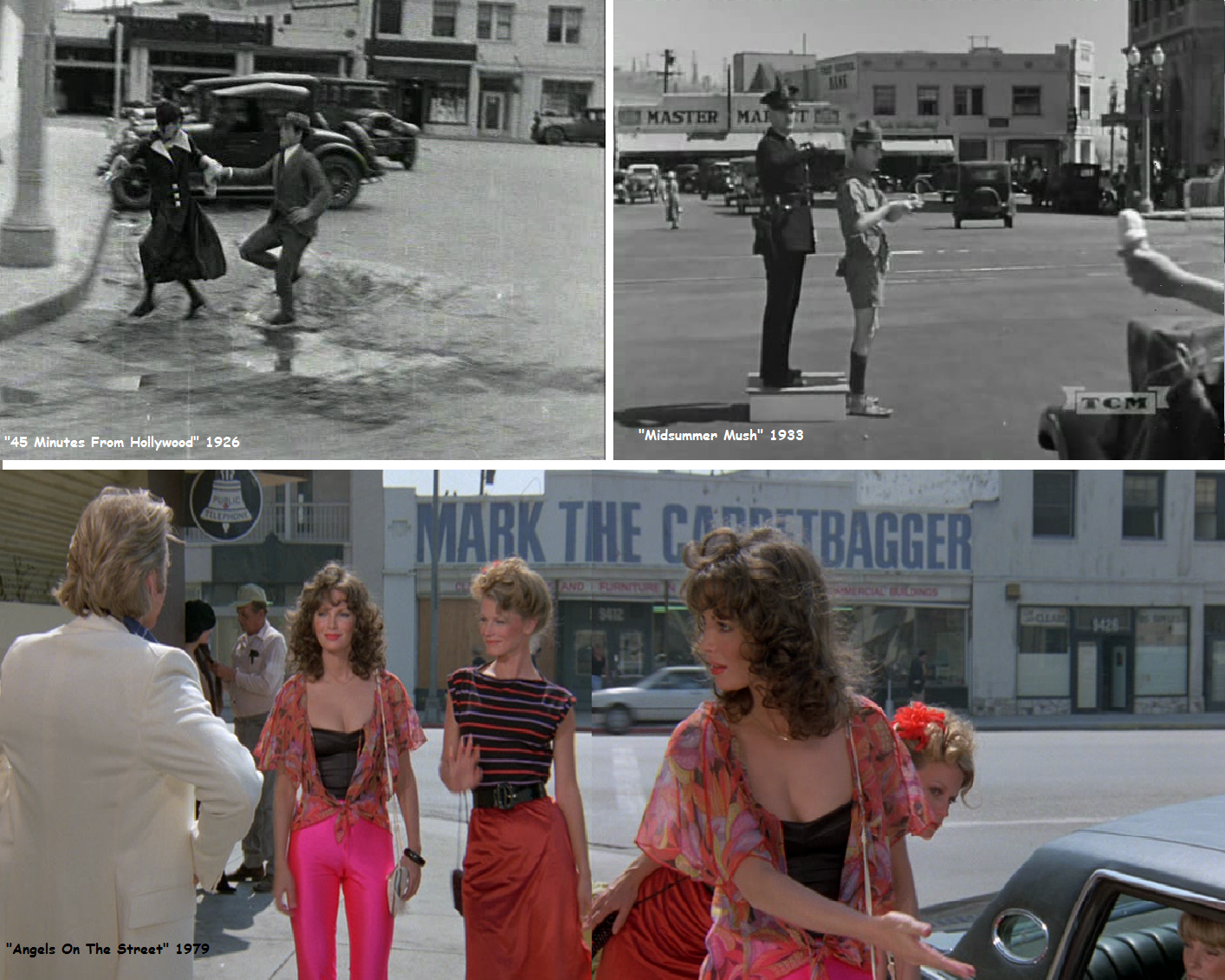 Main Street between Culver and Washington Boulevards was used many times by the Roach Studios for their location shooting. Above left, Glenn Tryon is seen in 1926’s “45 MINUTES FROM HOLLYWOOD” with the front of the Adams Hotel on the left side of the frame and the Safeway Store in the background. By 1933, the Safeway had become Master Market as seen in Charley Chase’s MIDSUMMER MUSH. Jaclyn Smith and Shelly Hack stand on the sidewalk in front of the Adams Hotel in “Angels On The Street”. The Safeway/Master Market was by then “Mark the Carpetbagger”.