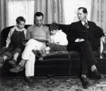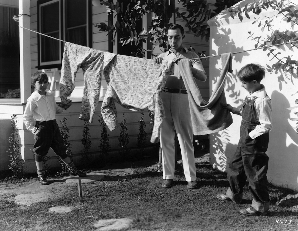 Keaton joined MGM in 1928, yet the Kennel does not appear on the 1929 Sanborn fire insurance map, nor in early 1930 aerial photographs of the studio. So perhaps it was built late in 1930. The Kennel photo at right, taken during the same publicity photo session as the other shots (notice the matching clothes), shows Buster and his sons hanging up to dry the distinctive pajama costume Keaton wore during Parlor, Bedroom, and Bath, released February 28, 1931, suggesting the Kennel was built prior to that date. Other accounts explain that Keaton began his MGM tenure renting a bungalow near, but off-site from, the MGM campus, infuriating studio head