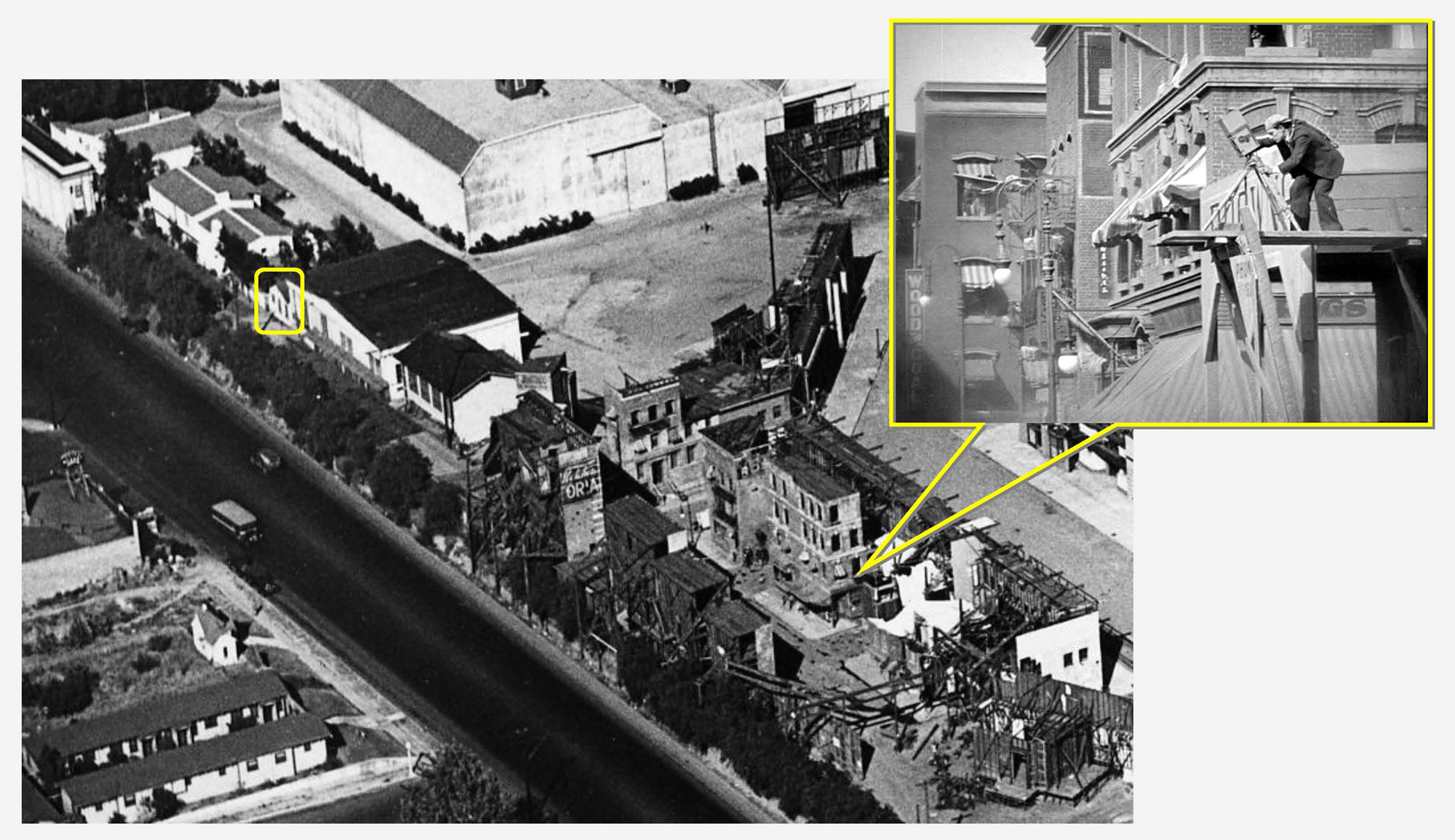 Above, three views looking east along the “New York” backlot, The Cameraman, upper left, The Sidewalks of New York, lower left, and a matching 1933 aerial view.