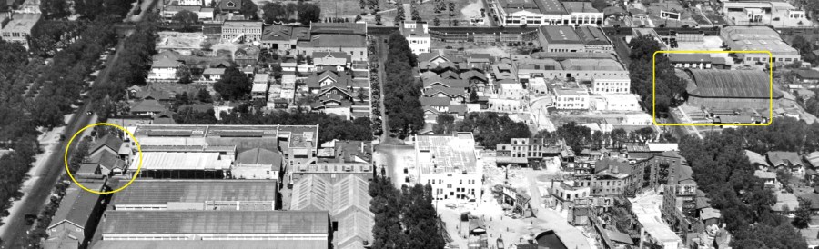 Looking north at Famous Players – Lasky Studios. The oval marks the famous “barn” on Selma and Vine, now relocated across from the Hollywood Bowl, and home to the Hollywood Heritage Museum. The box at right marks the former stadium on LLL Street. Marc Wanamaker – Bison Archives.