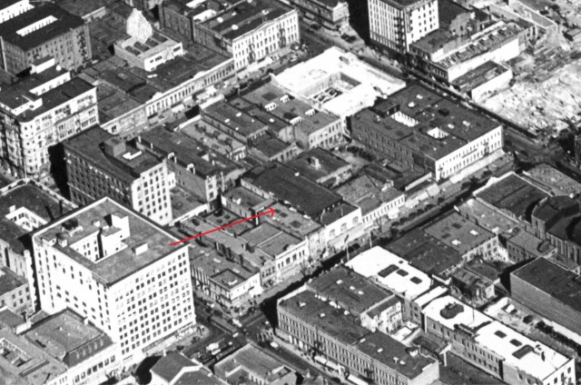 Above (click to enlarge), this 1927 view is one of several vintage aerial views that helped to identify this closing scene. The arrow marks the camera’s point of view.