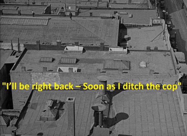 volleyball net (below). But the joke preceding Earl, the second to last joke of the entire film, tops off the running gag by showing Noah still chasing after Bill on a faraway roof down below, with Bill still pleading to Harold in tiny intertitle print “I’ll be right back – Soon as I ditch the cop.”