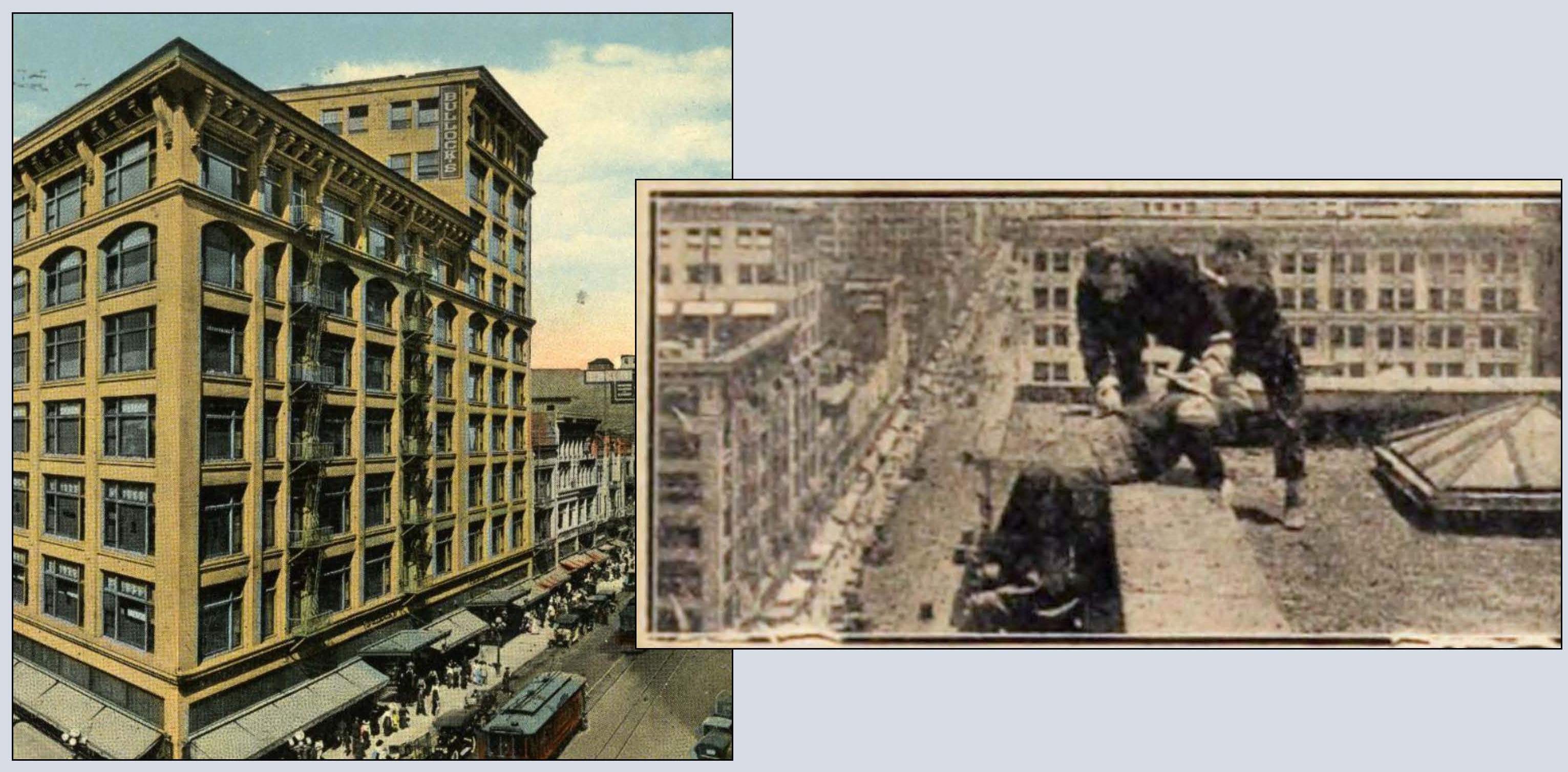 Above, the two stunt images from Ignatz touted in the July 8, 1916 Moving Picture Weekly trade advertisement; (left) looking west down 8th at the Hamburger’s Department Store, and south down Broadway (right). Both scenes were staged from atop the 1912 Chapman Building at the NE corner of 8th and Broadway.