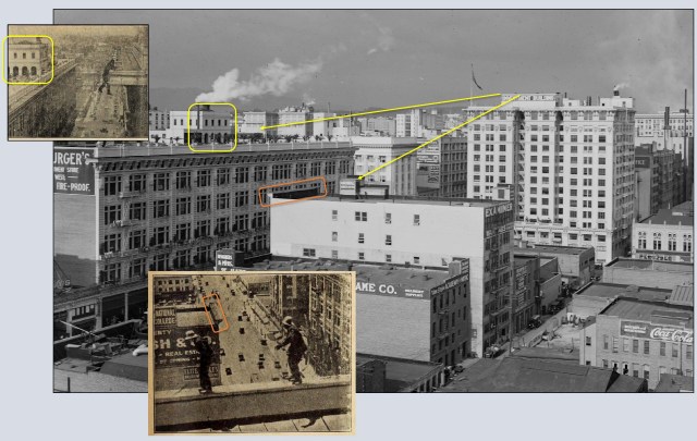 Click to enlarge – above, looking north up Broadway towards the two story structure atop the Chapman (Investment) Building where the filming took place. The “Examiner” Building (orange) and the four tall buildings immediately behind it all remain standing. USC Digital Library.