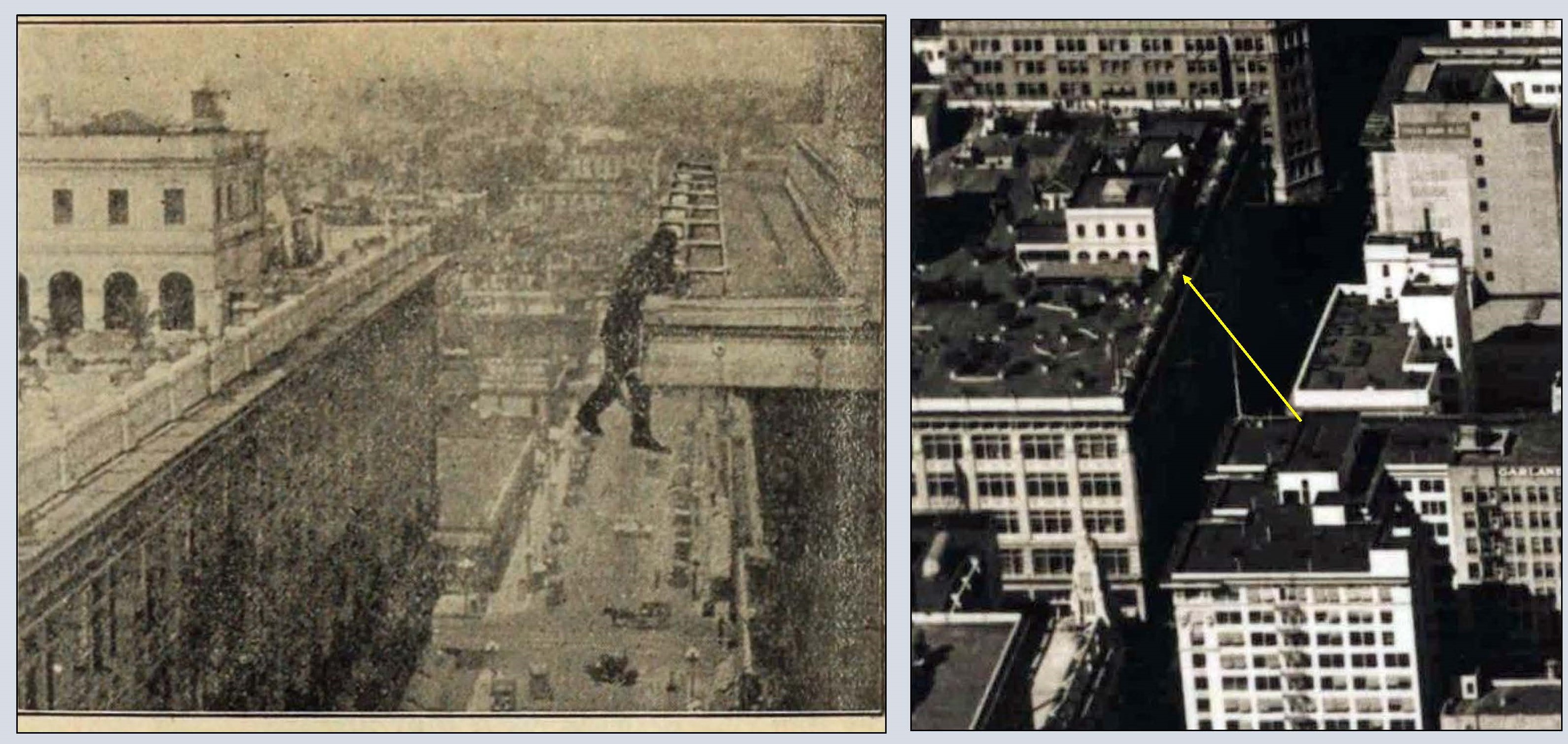 Matching views west – the extant Chapman Building (756 Broadway) has a small two story structure on its large rooftop, where Billy Armstrong crawled around presumably with scaffolding or nets below out of camera range, but far from the 13 story drop to the street.