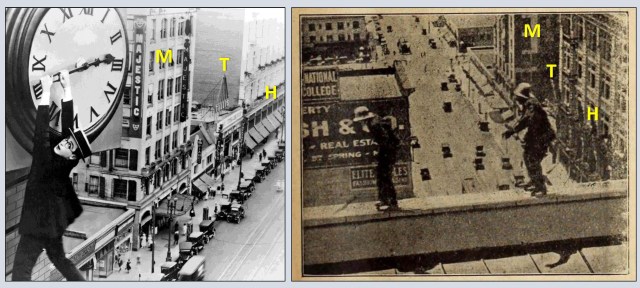 Ignatz was filmed atop 756 S. Broadway looking south towards the same block appearing north behind Harold Lloyd, where he filmed the clock scene from Safety Last! atop 908 S. Broadway. Notice the opposite views of the Majestic Theater (M), Tally’s Theater (T), and Hamburger’s (M). Marc Wanamaker – Bison Archives.