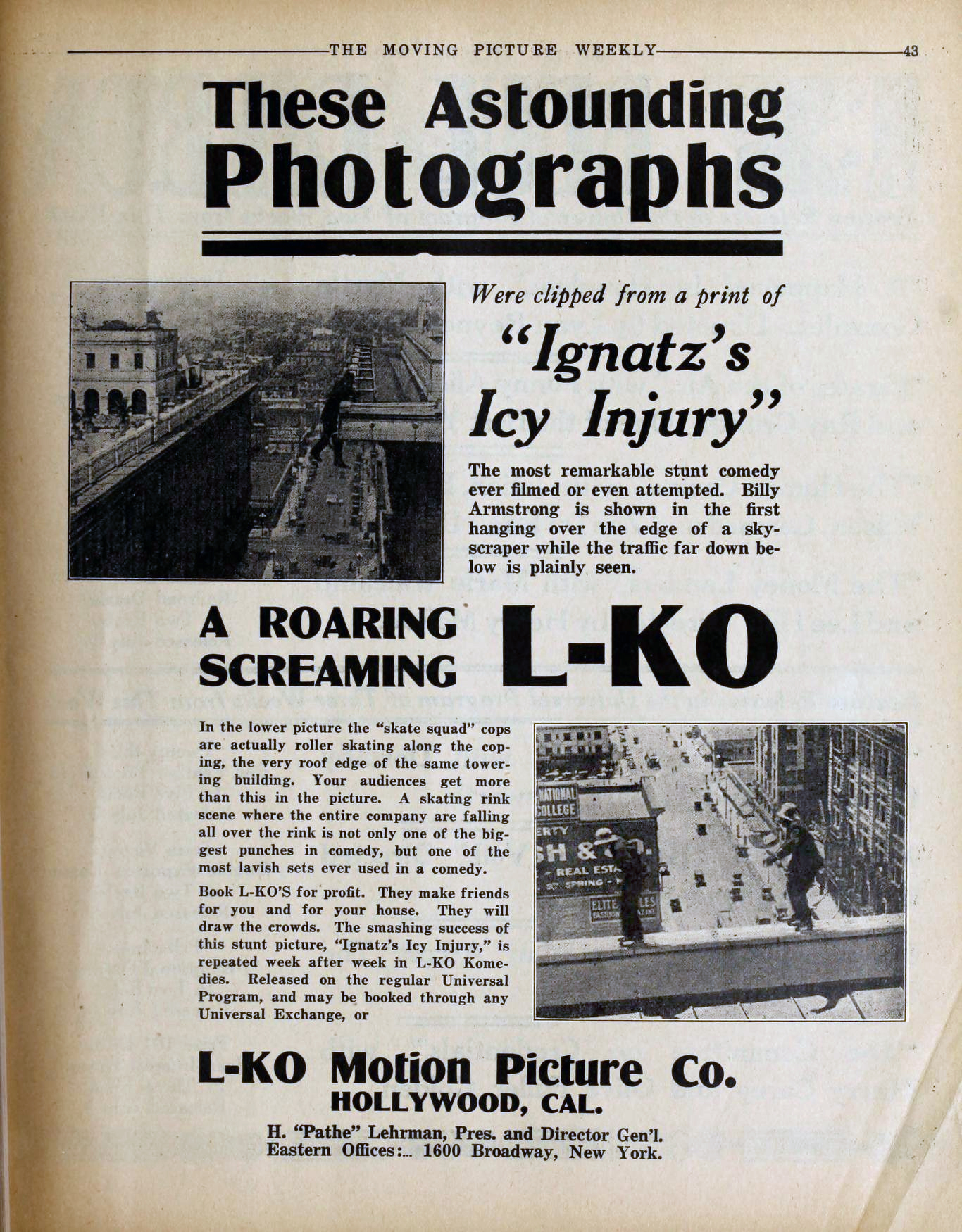 Using Lantern Media to research Ignatz, the L-KO Kompany’s Billy Armstrong comedy promoted at right in Universal’s The Moving Picture Weekly trade magazine, I quickly happened upon two other contemporary L-KO stunt comedies promoted by Universal, Billie Ritchie’s A Bold, Bad, Breeze (1916), and Dan Russell’s Rough Stuff (1917). As we’ll see, these three films share much in common with each other and with other stunt comedies of the era.