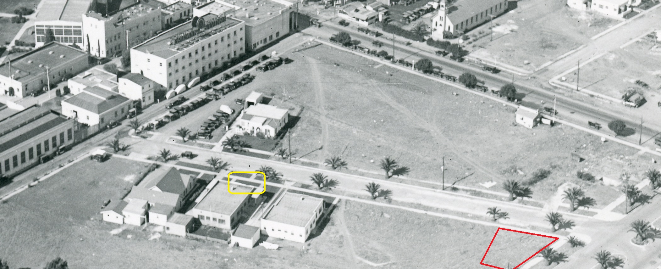 A 1924 view north of Grant Avenue next to the then Goldwyn Studio, before the funeral parlor on Grant and Madison (red box) was constructed. Keaton posed for all of the photos, including the 1929 Resolution photo at the top of this post, within the yellow box. Assuming the duplex to the right was symmetrical, the window pattern visible on the right (east) side of the duplex matches the window pattern appearing behind Buster’s Resolution photo, which shows the left (west) side. The driveway also matches the Resolution photo. HollywoodPhotographs.com