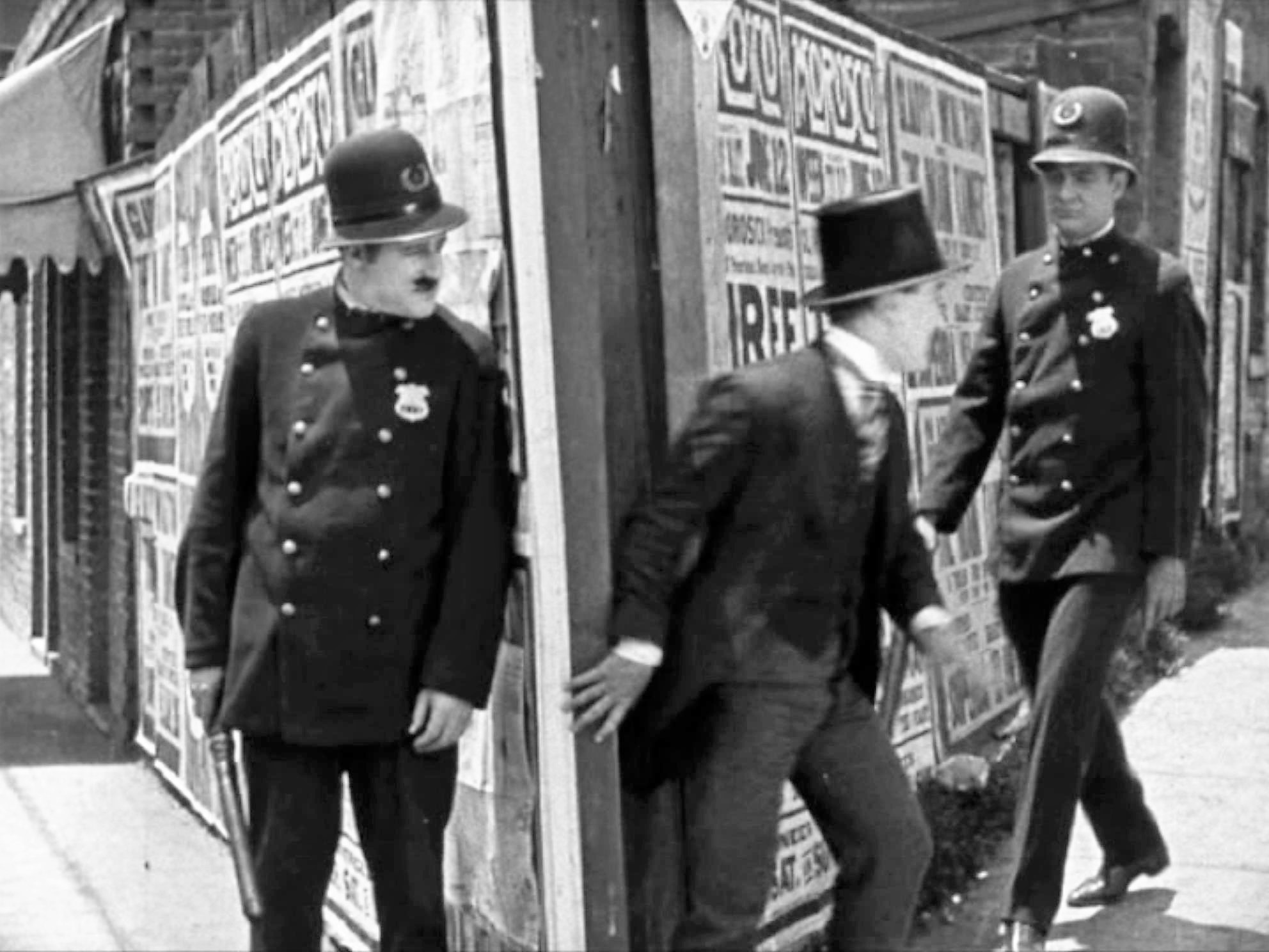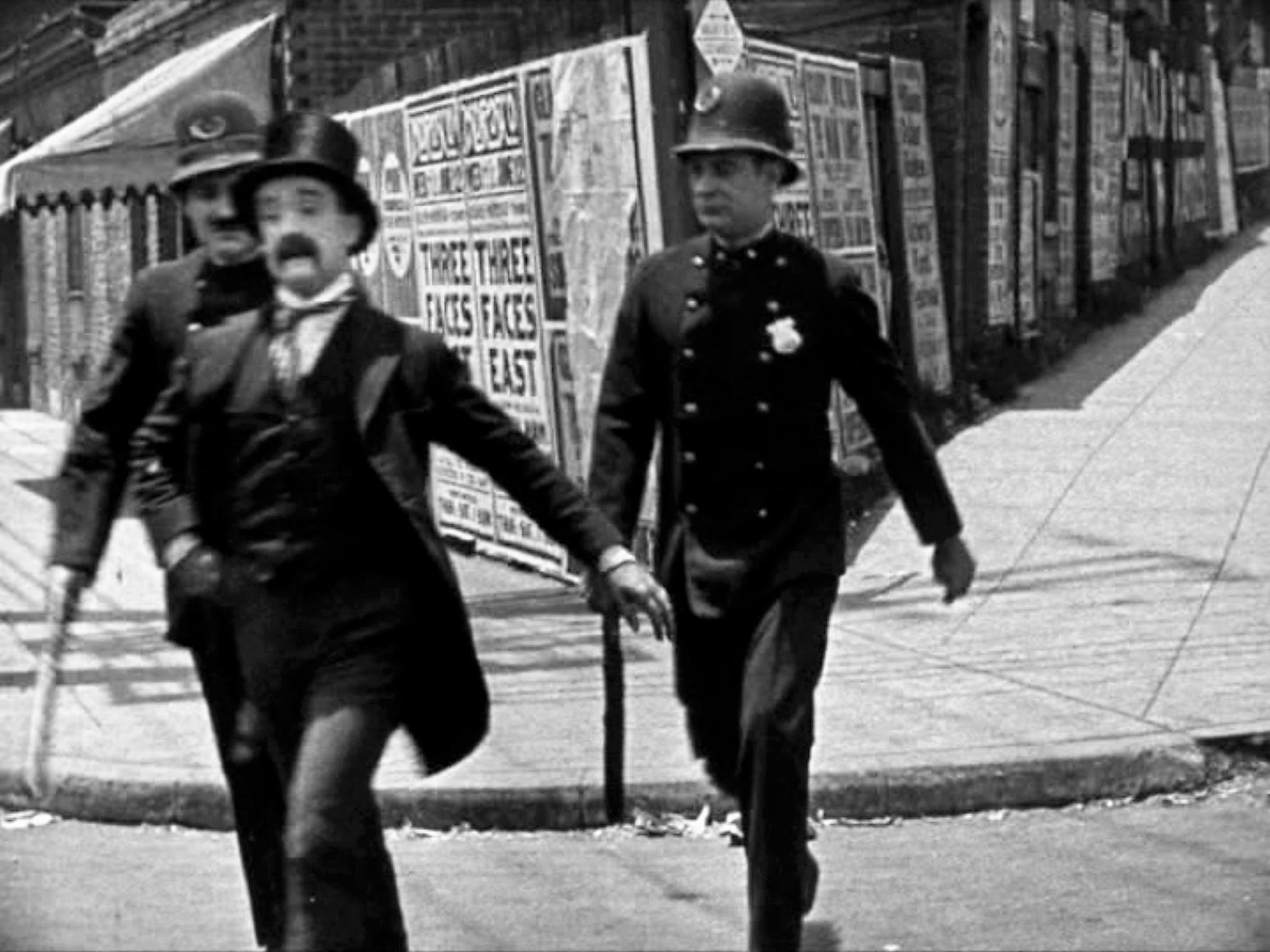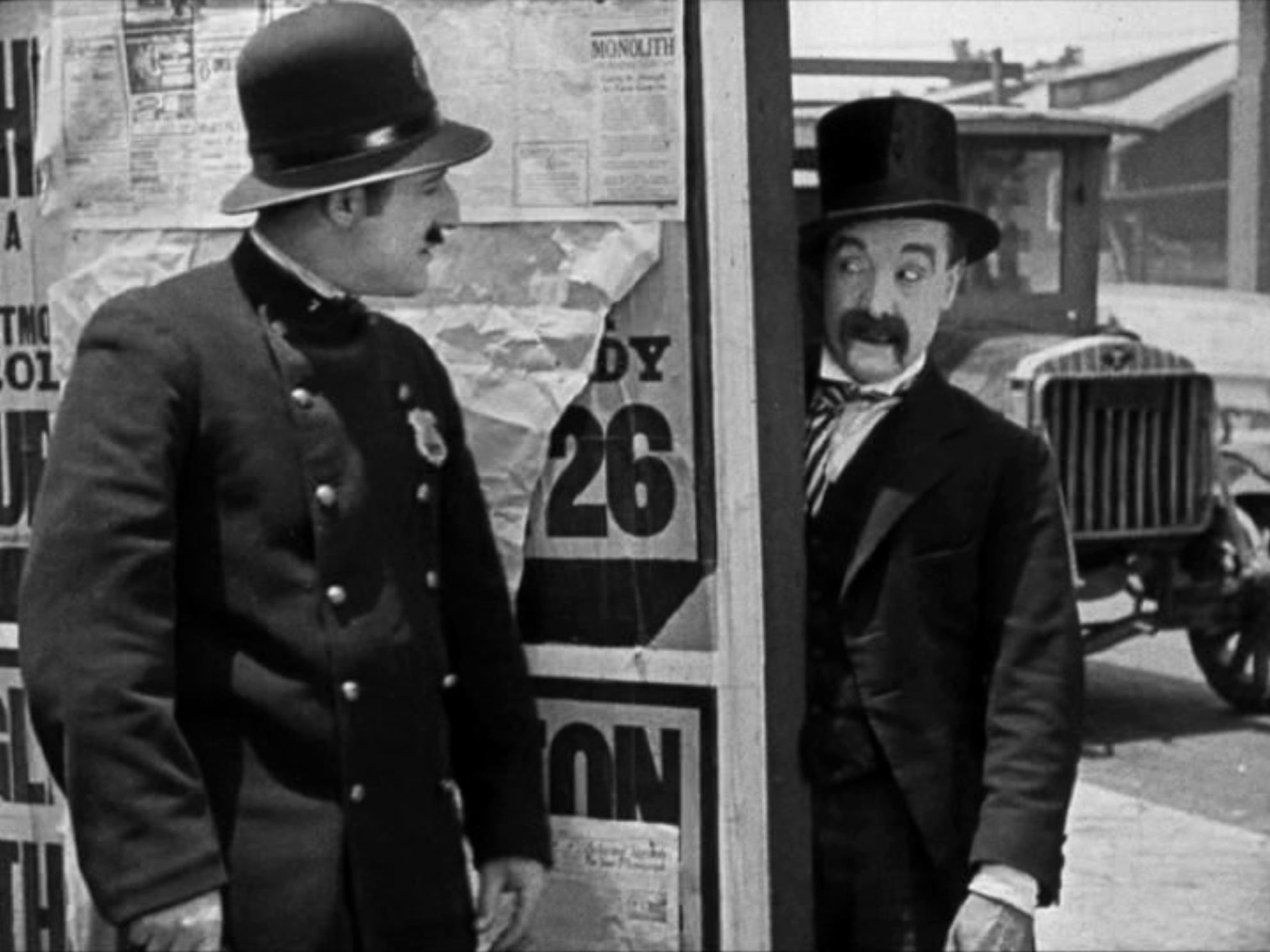 Quick – what are some essential elements for a silent comedy? A park bench? An angry cop? A banana peel? If you think about it, one absolutely essential geographic element is the humble street corner. It doesn’t matter what the corner looks like. It simply has to hide the cop lurking around the other side, so both the film comic and audience will be startled when he jumps into view. Other times a broad point of view reveals both sides of the corner, allowing the audience to anticipate the cop grabbing the unsuspecting comic, or showing two dashing figures on a collision course.