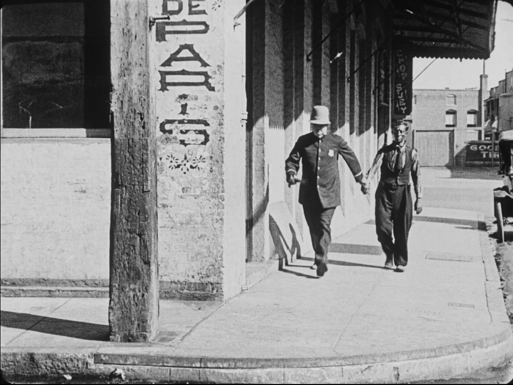 Above left, Fifteen Minutes also has scenes filmed a block away from the crazy corner, looking south from Sanchez Alley down Arcadia towards Los Angeles Street, now lost to the freeway, matching scenes appearing in Buster Keaton’s Neighbors (1920) above center, and Cops (1922) above right.