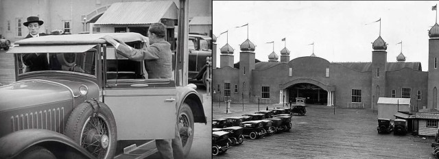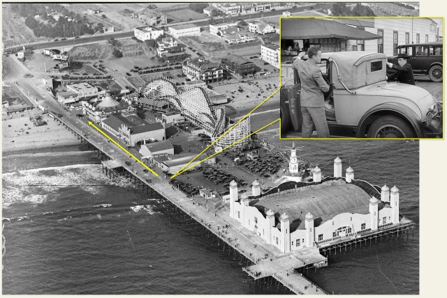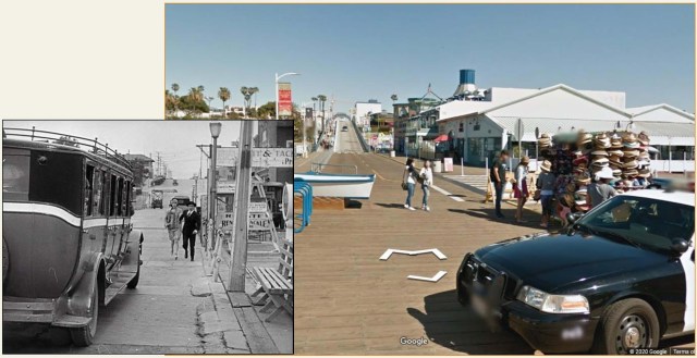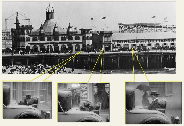 Of course there’s only room for Buster at back in the rumble seat. As soon as they take off it begins to pour, completely drenching Buster by the time they return to town. As shown above, they drive east along the pier past the Bowling-Billiard building and the Loof Carousel-Hippodrome, both still standing. USC Digital Library.