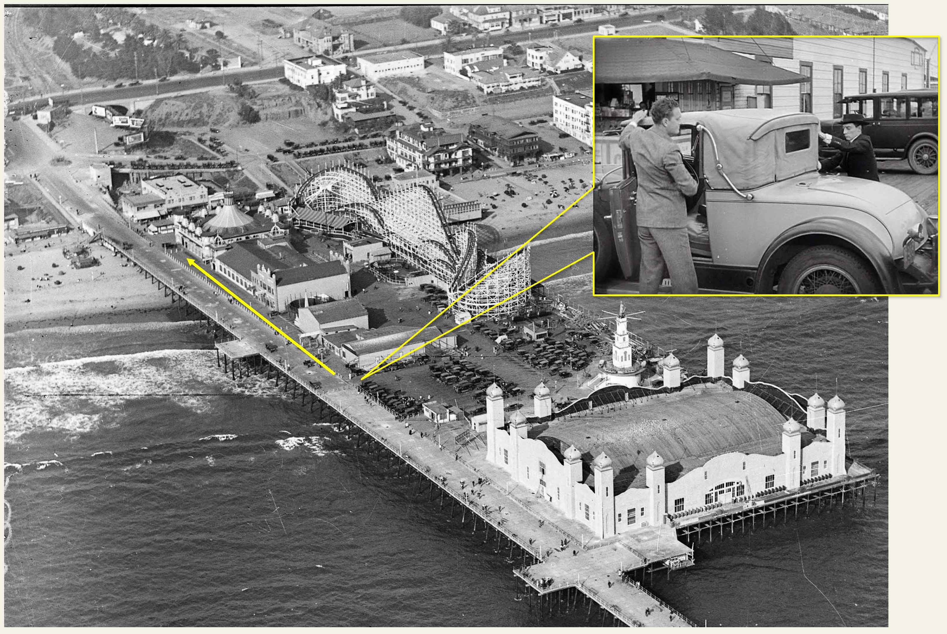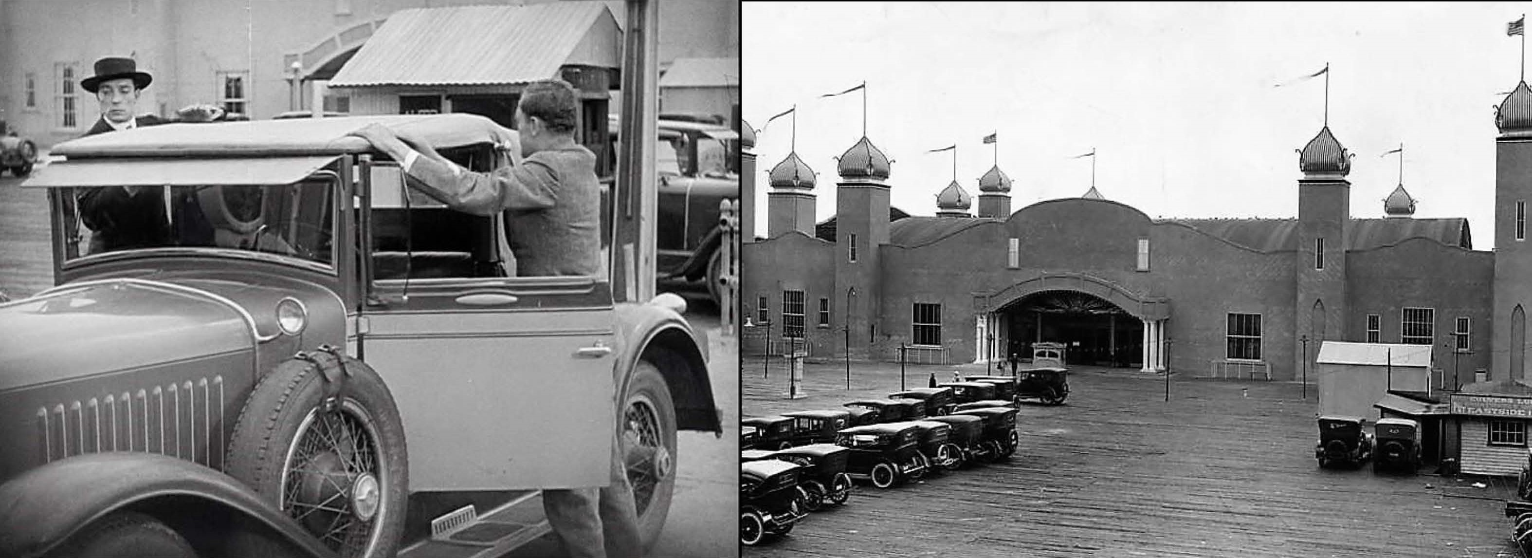 Click to enlarge – after missing the bus, Buster’s rival for Marceline’s affection, smooth-talking Harold Goodwin happens to drive by, and offers them a ride home. Notice the giant La Monica Ballroom in the foreground. Inset above, Buster helps Harold with his car roof. Huntington Digital Library.