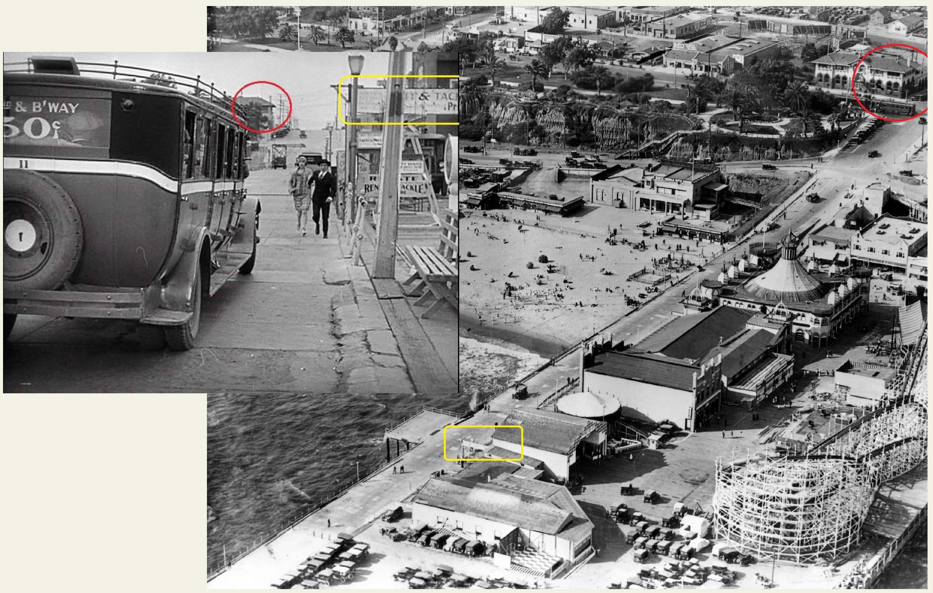 When it’s time to return home Buster and Marceline fail to catch an overcrowded bus, not in Venice where the plunge was located, but running down the Santa Monica Pier. The downhill slope in the background was the initial clue. The bus strategically blocks the side of the pier from view, and no shot in the sequence betrays it was filmed on a pier.