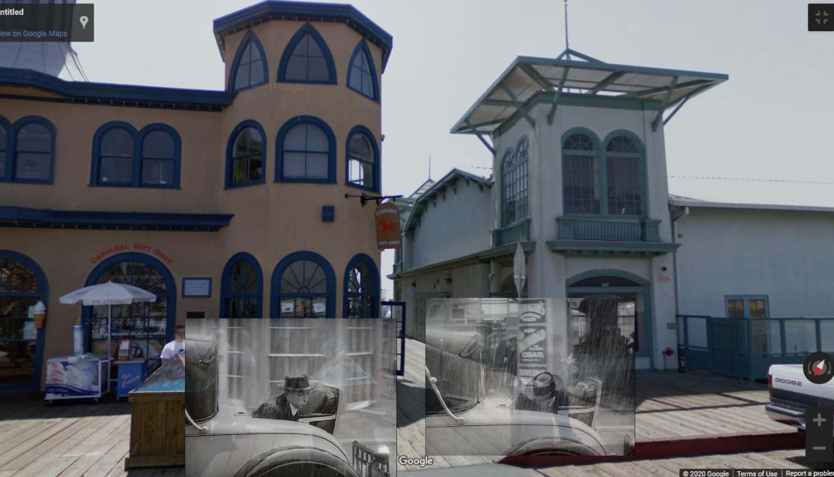 Of course there’s only room for Buster at back in the rumble seat. As soon as they take off it begins to pour, completely drenching Buster by the time they return to town. As shown above, they drive east along the pier past the Bowling-Billiard building and the Loof Carousel-Hippodrome, both still standing. USC Digital Library.