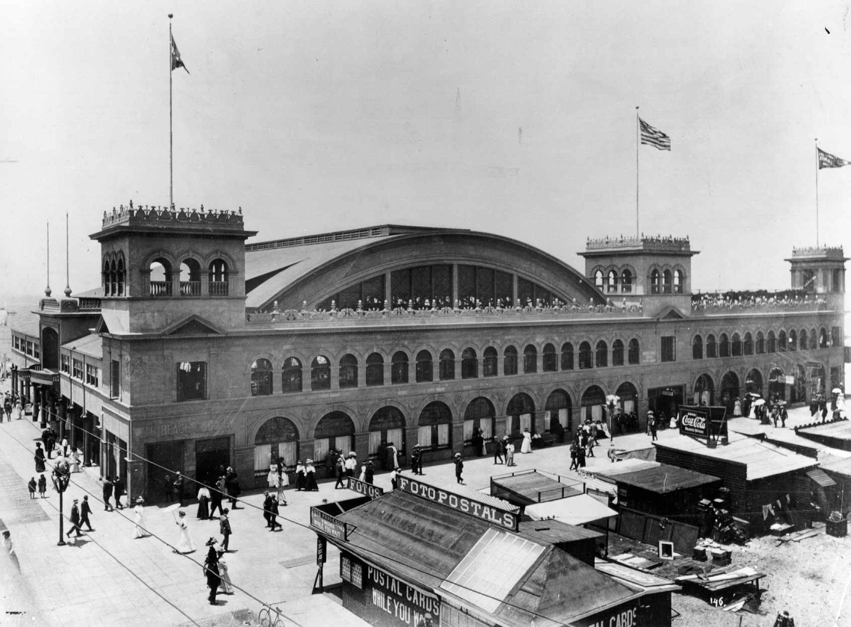 As they adjust the roof, the entrance awning to the landmark La Monica Ballroom (1924- 1963) appears at back. Situated on the far end of the pier, the La Monica was once the largest dance hall on the west coast, with a capacity of 5,000. Again the camera angle hides nearly all of the background detail. LAPL.