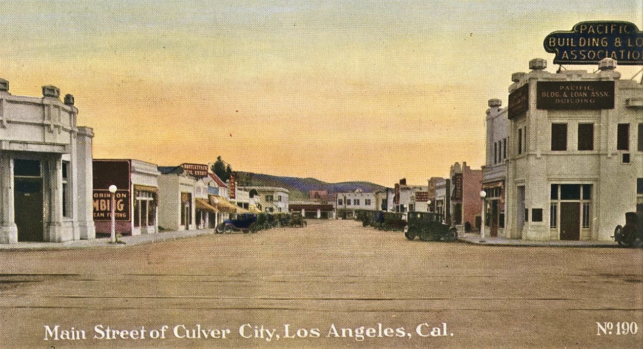 Pre-dating Roach, Arbuckle and Keaton made their final short comedies The Hayseed (1919) and The Garage (1919) at the Lehrman Studio facilities in Culver City before the Roach Studio was even built.  So when Roscoe and Buster needed street corners and intersections, they too filmed at these streets in Culver City and Palms.  As shown above, Roscoe battles a fire hose at the north end of Main in The Garage.