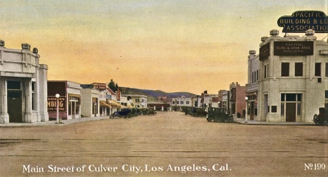 Looking north, the pants gag was filmed on the middle, left side of Main Street in Culver City, just south from Roscoe’s fire hose scene. Conveniently located to the studios, this modest commercial street, only a single block long and originally divided by planters of palms trees, would later appear in dozens of Roach comedies. Notice the crenelated bank building corner at the far right end of the street. HollywoodPhotographs.com.