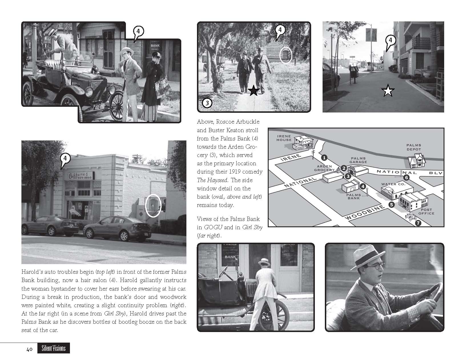 A year before the Roach Studios opened in Culver City, Roscoe and Buster also filmed many scenes from The Hayseed (1919) in Palms at the intersection of National and Motor Ave., a site that would later appear in dozens of Roach comedies. I hope to cover The Hayseed in a future post, but here’s a taste, page 40 from my Harold Lloyd book Silent Visions, showing Roscoe and Buster walking north up Motor from the former Palms Bank building, also appearing in Lloyd’s Get Out and Get Under (1920) and Girl Shy (1924).
