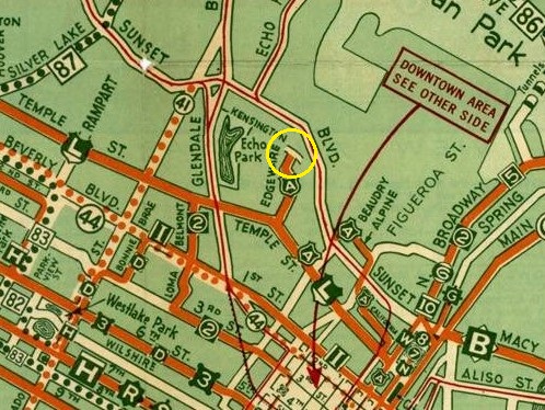 Above, the Douglas Street filming site near Echo Park was situated at the very north end of the Los Angeles Railway “I” line (circle at left), which allowed the remaining 99% of the line to continue in service during these stunts. This view above north shows the line end, at Douglas and Kensington. Robert T. McVay photo – Robert Cantos Collection.